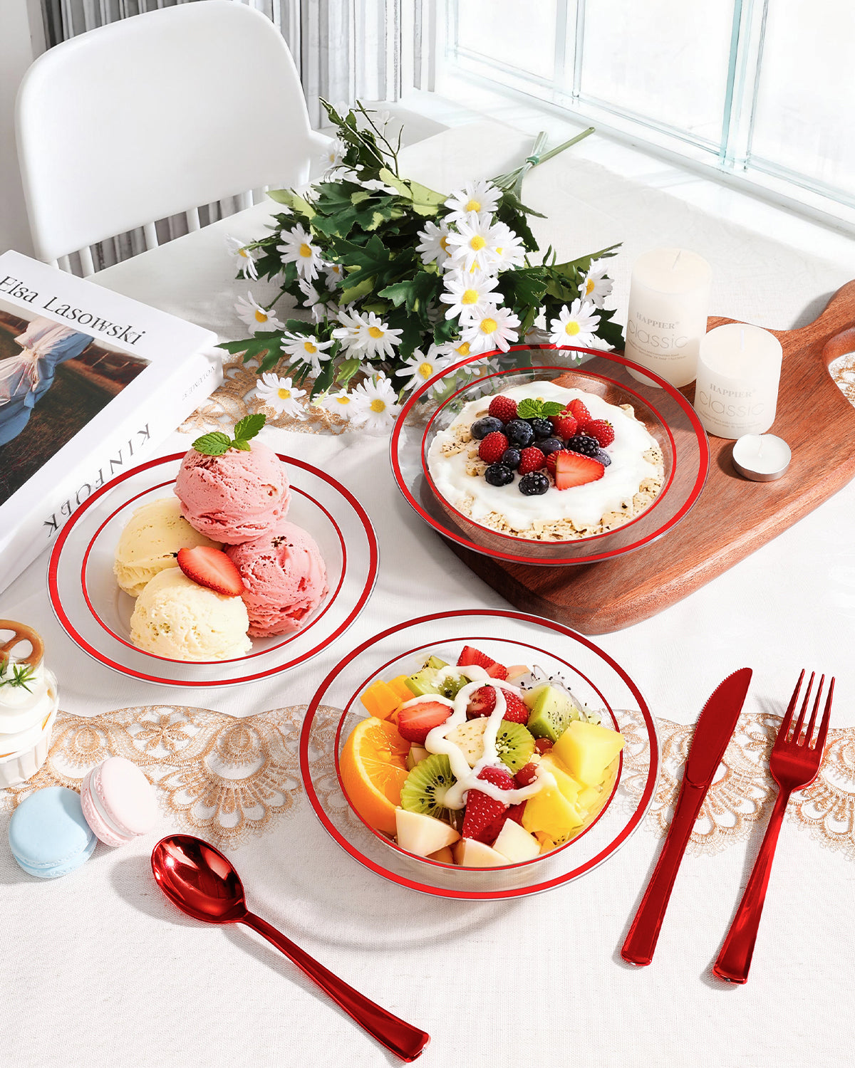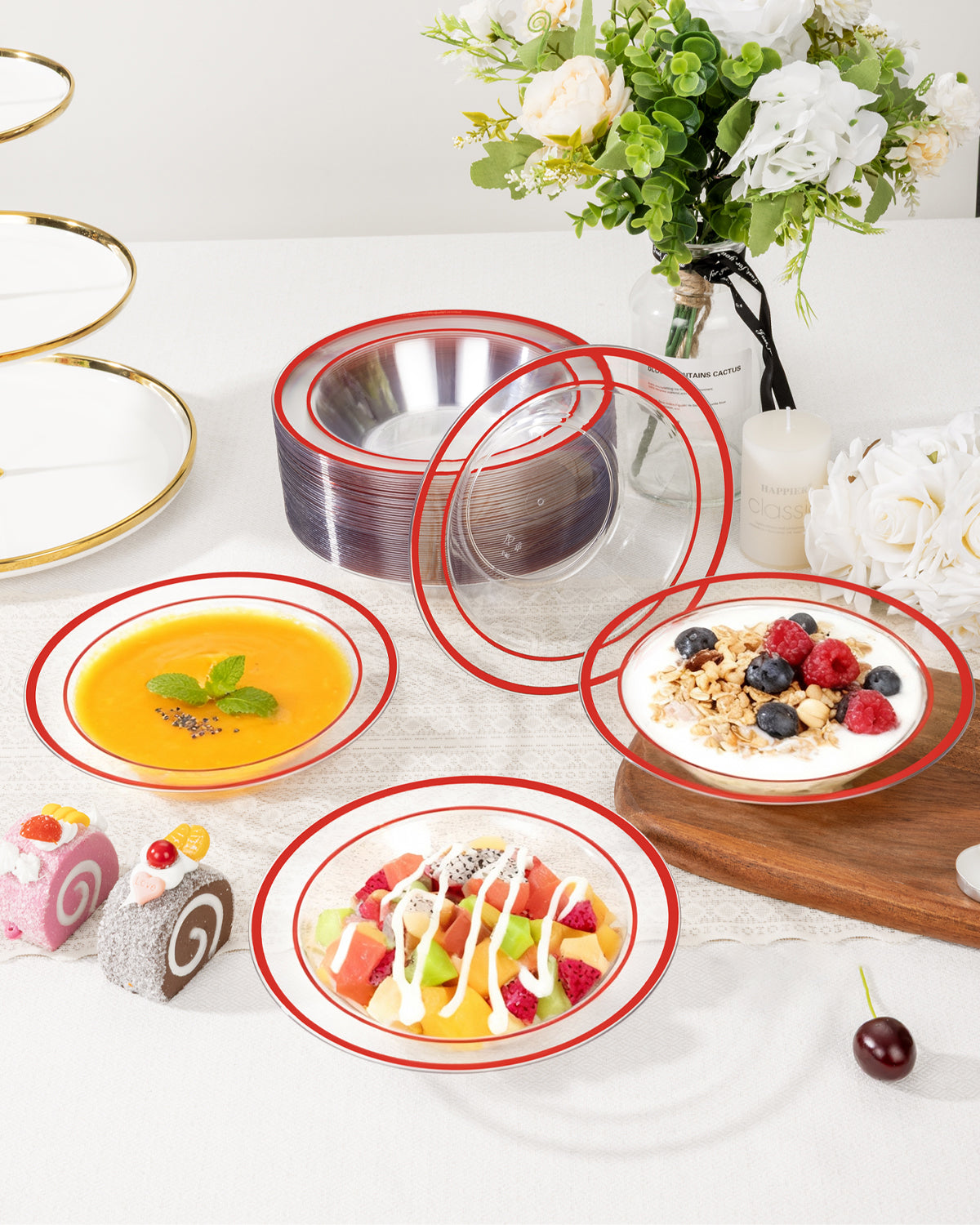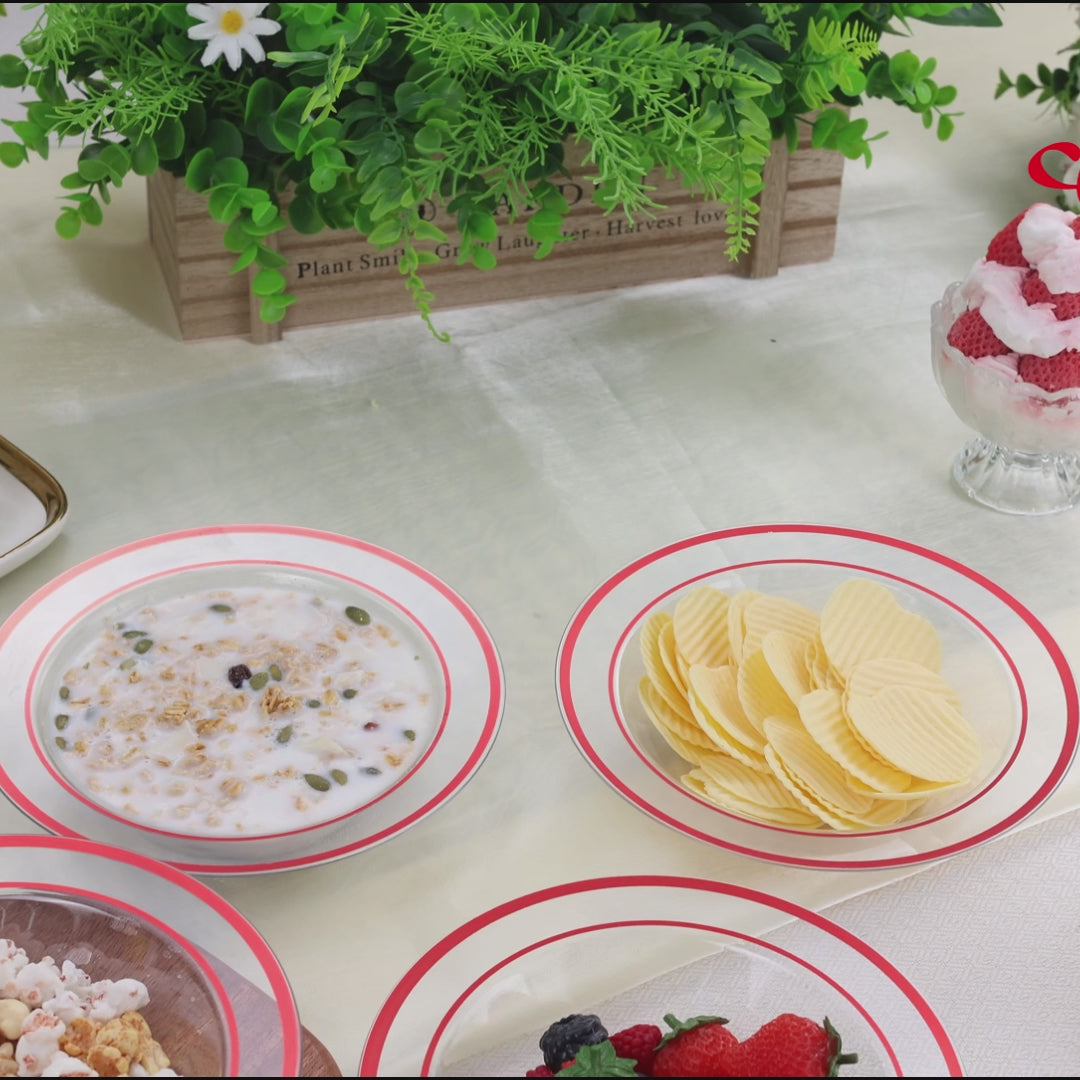 These red rimmed disposable bowls are great for entertaining large groups. They are attractive and fancy and large enough for a serving of soup, fruit salad or dessert. We used them for soup at our last party and the bowls handled the heat well. The bowls hold 12 ounces. And at the end of the party you can toss them or wash by hand and reuse.