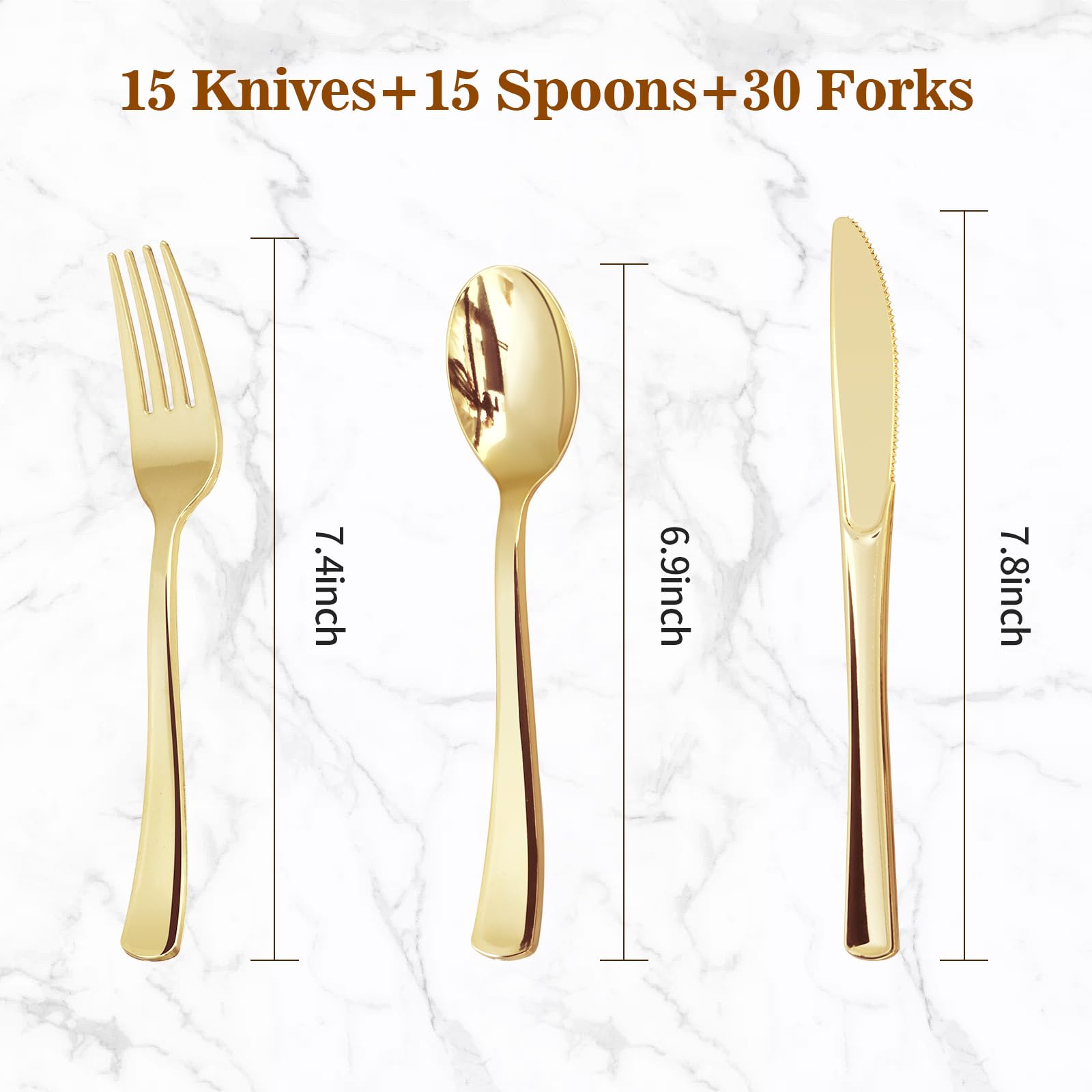 This gold plastic silverware set is excellent and exactly what I was looking for. Looks nice and is very sturdy.my guests thought that they were real before they picked them up and then realized they were not. Makes the event elegant.