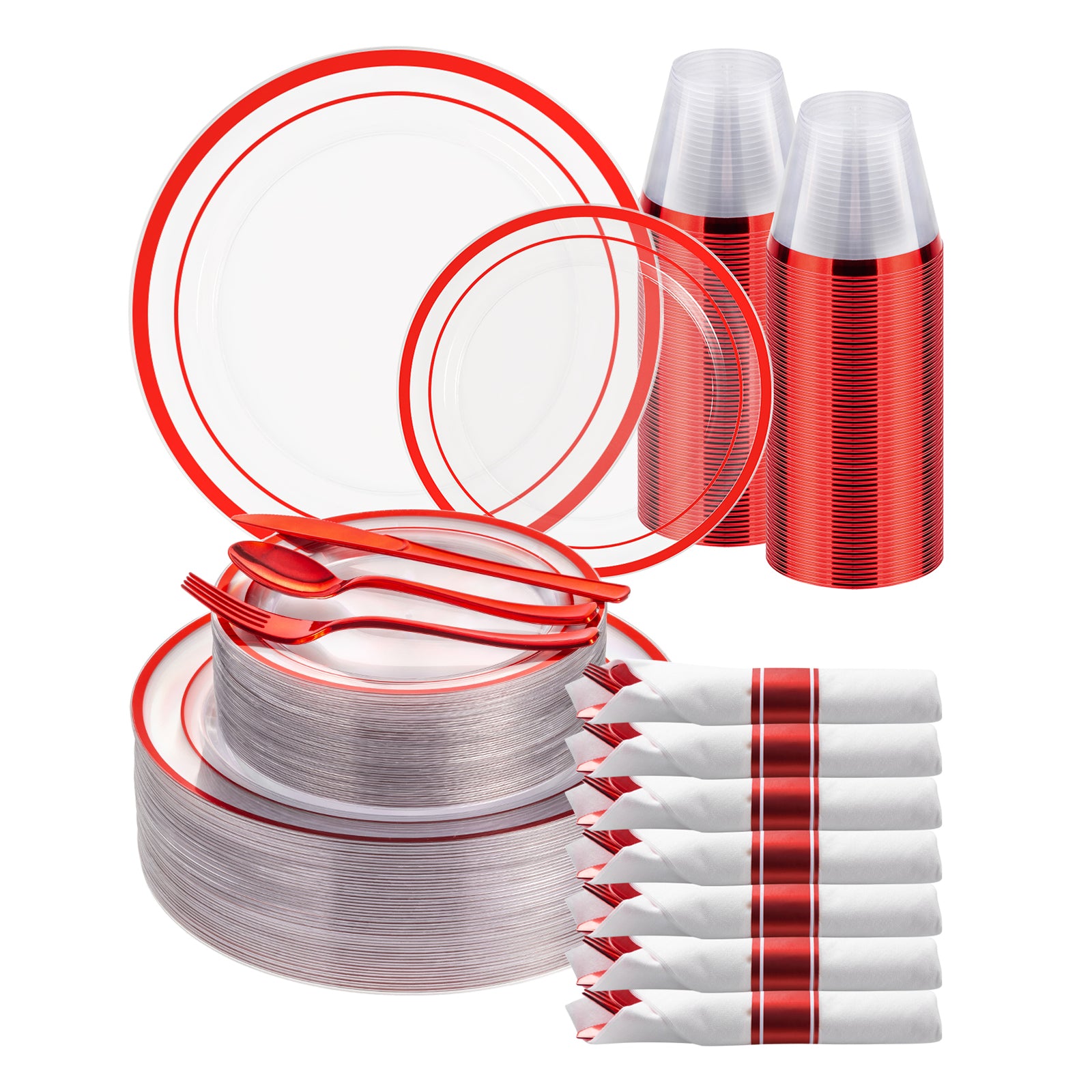 Goodluck 350 Piece Disposable Clear with Double Red Rim Plastic Dinnerware Set for Party, Christmas, Graduation, Wedding