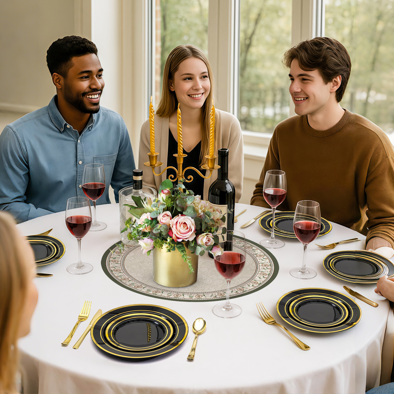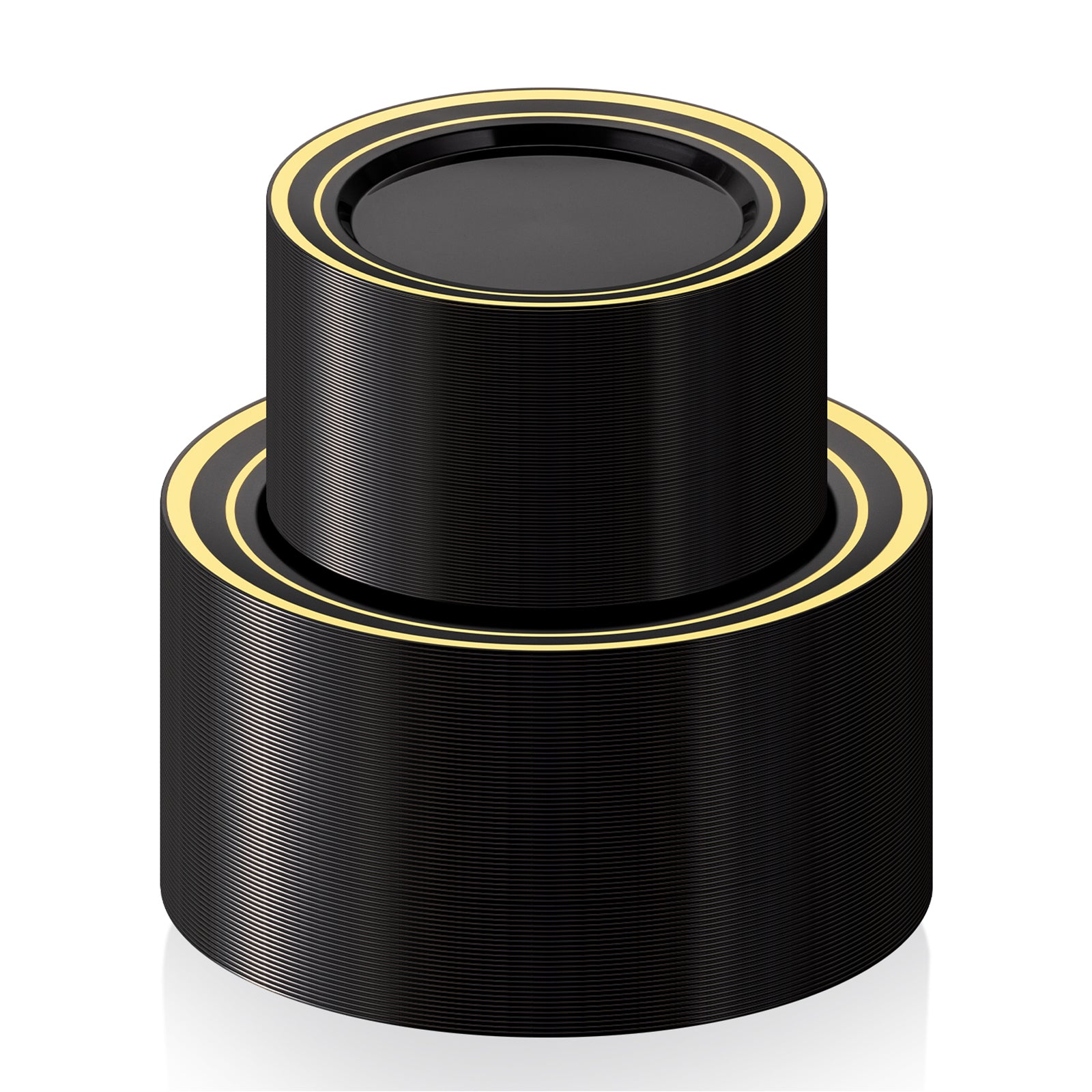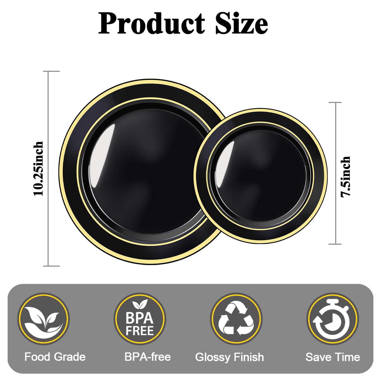 Goodluck Premium Disposable Black with Gold Rim Plastic Plates Set for Party, Wedding, Holiday, and Halloween