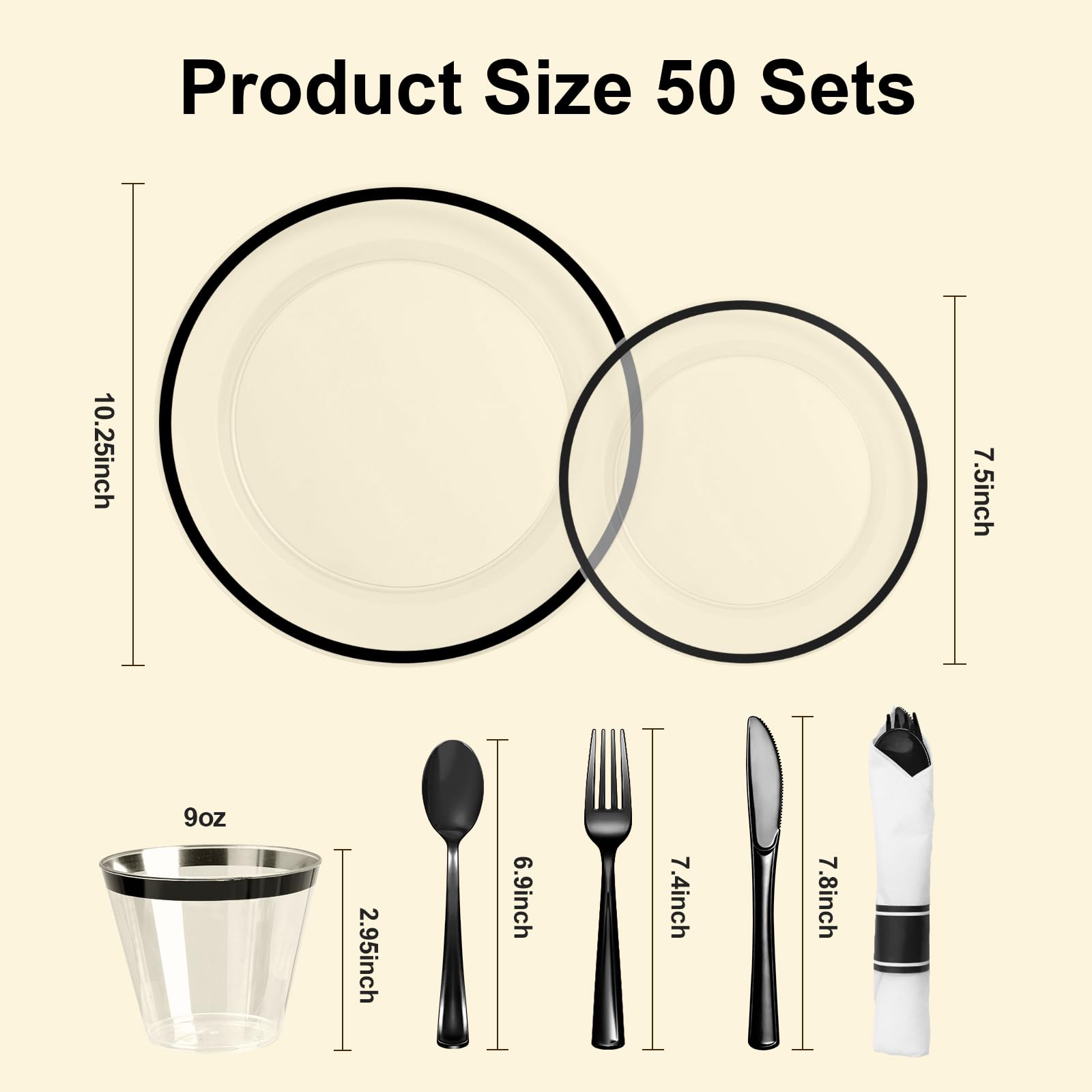 Dinnerware Includes: 50 10.25" dinner plates, 50 7.5" salad plates, 50 plastic knives, 50 plastic forks, 50 plastic spoons, 50 9oz plastic cups, and 50 pre-rolled napkins