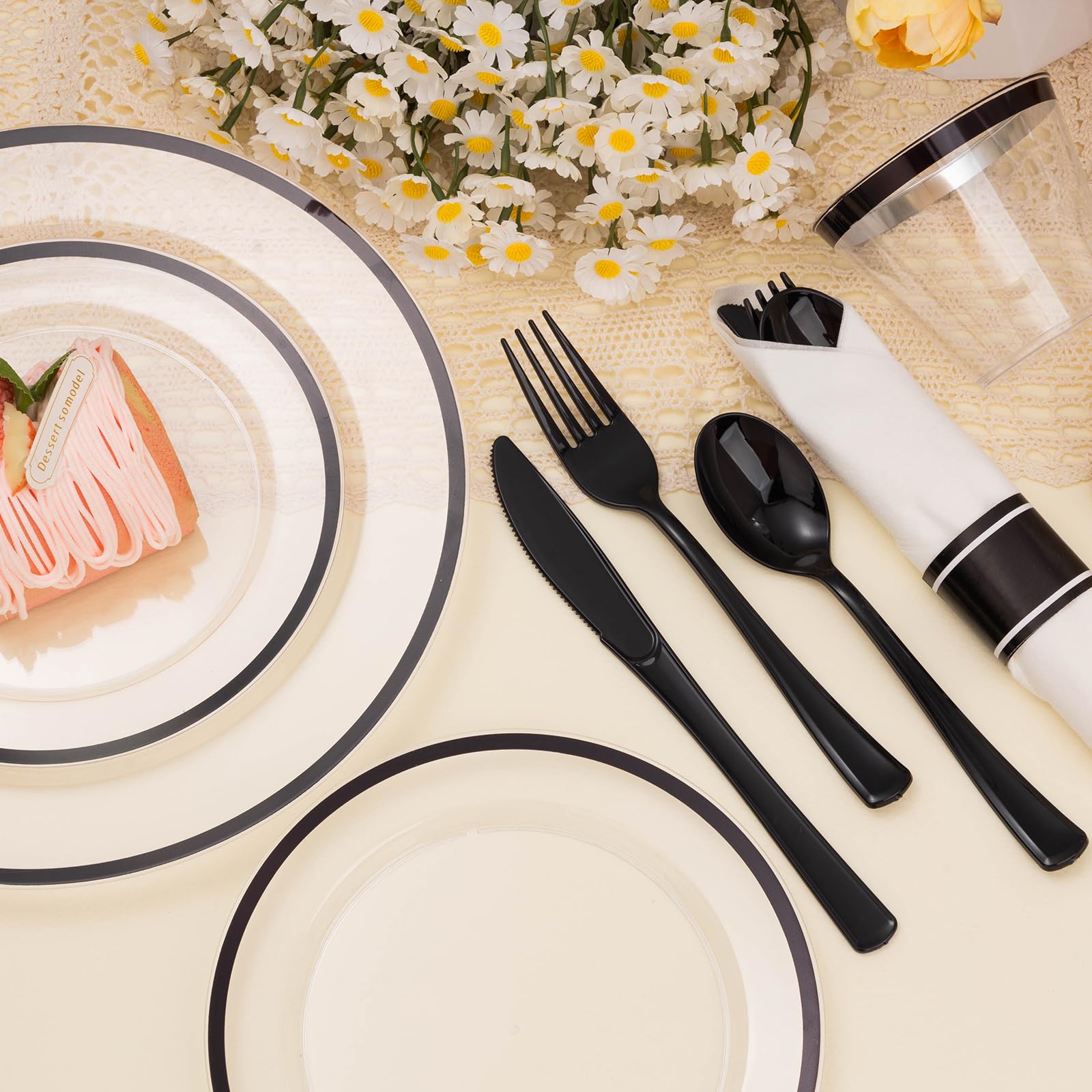 Goodluck 350-Piece Disposable Clear with Black Rim Plastic Dinnerware Set for 50 Guests