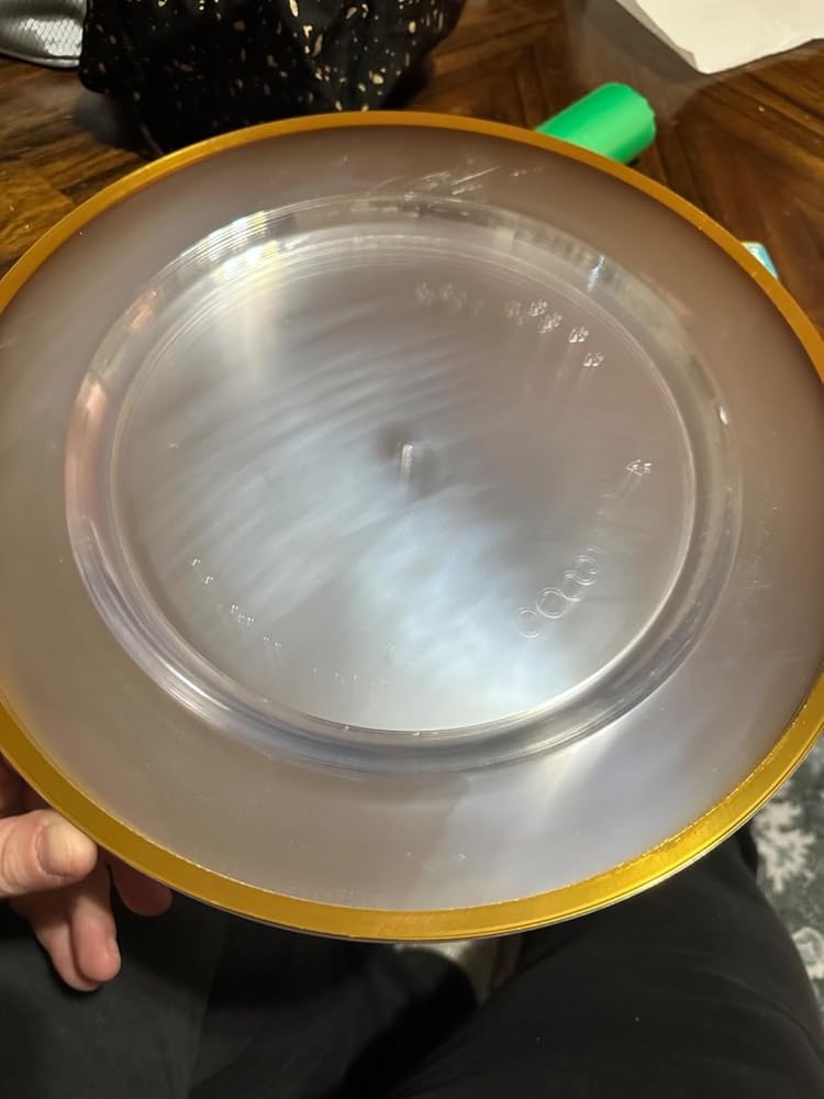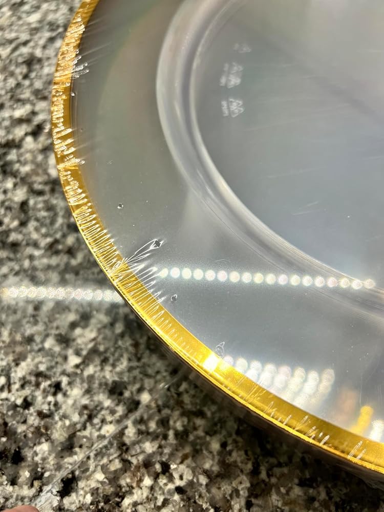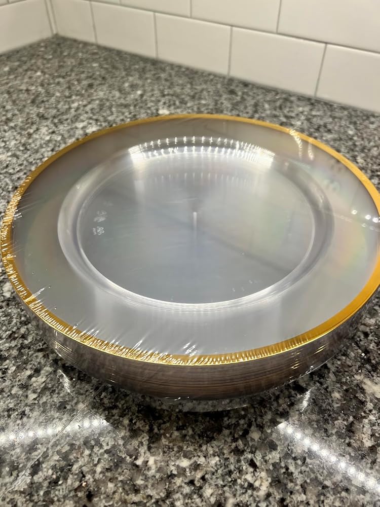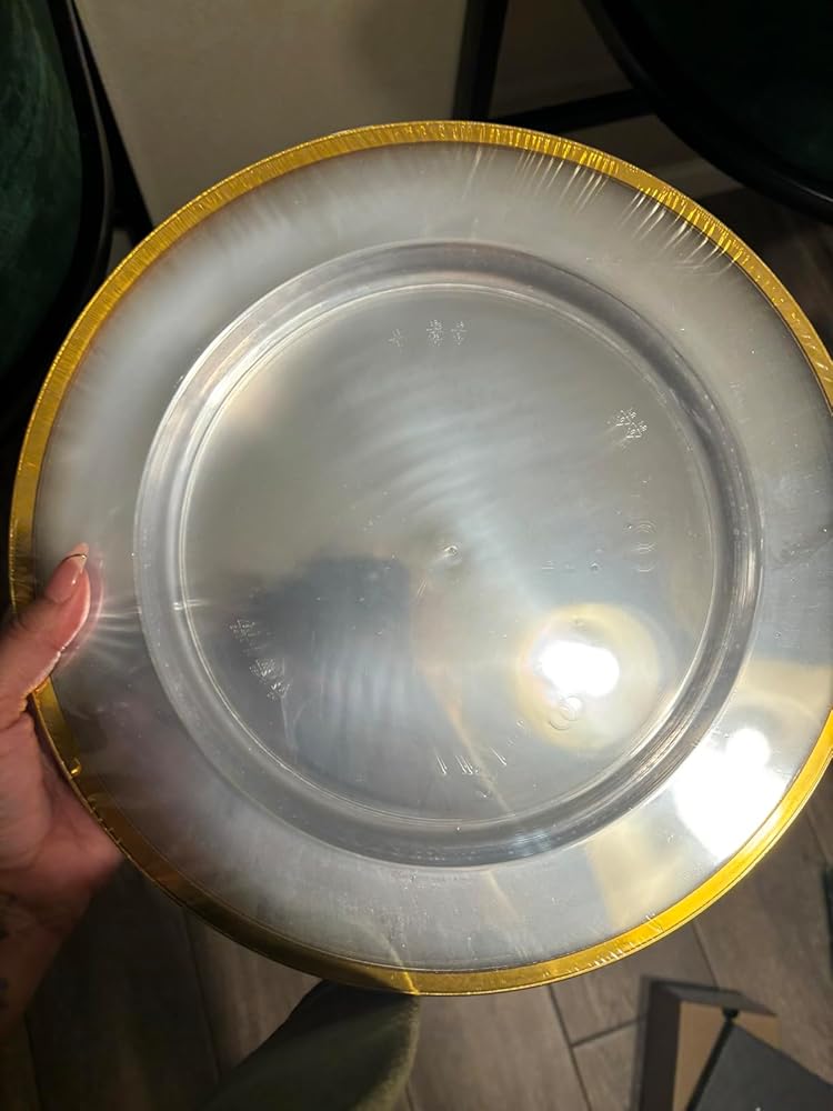 These are classic and quality plastic chargers great for any occasion. We��ll be using them for a baby shower. Clear in the center with gold around the edges, they are a beautiful way to elevate your table display!