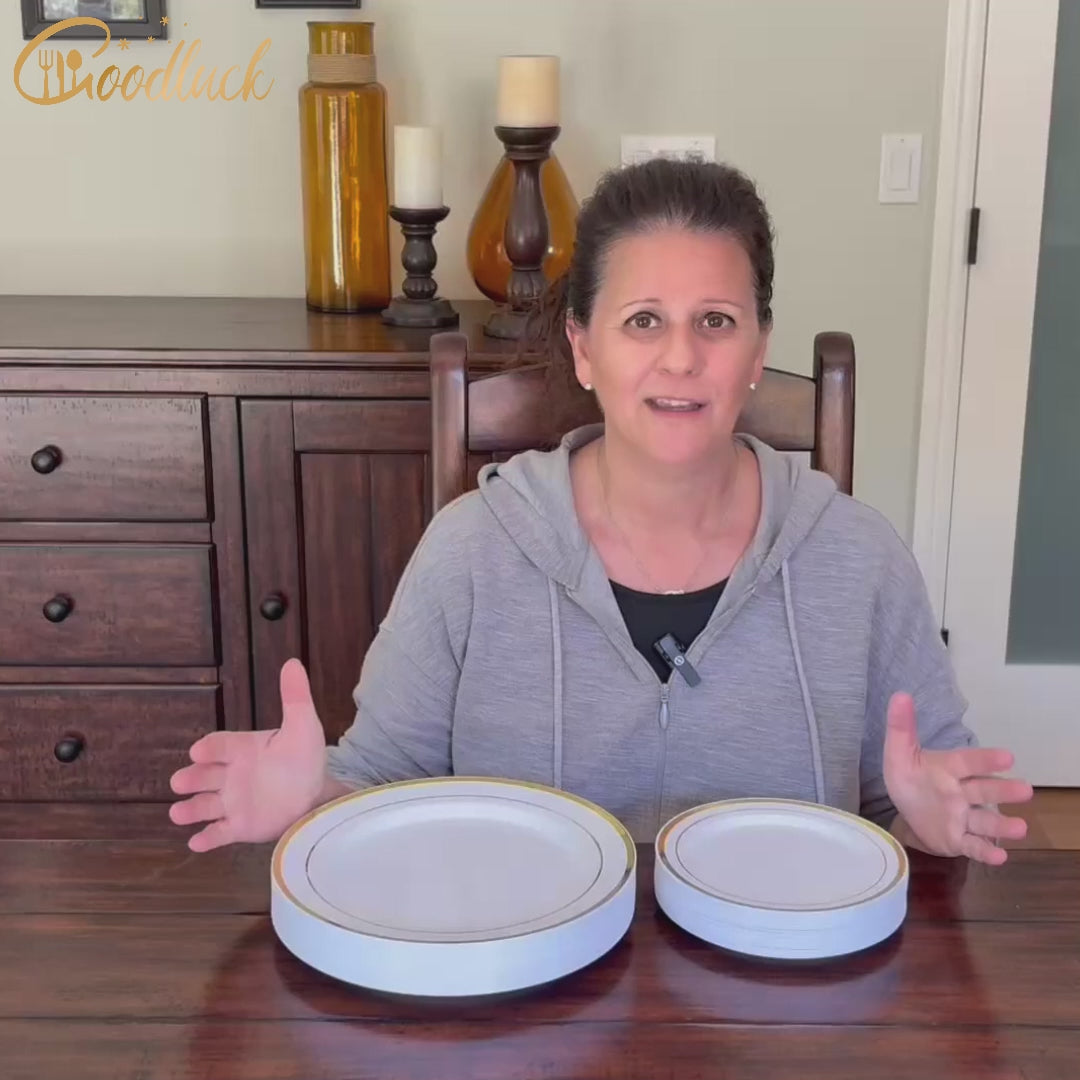 These plates were perfect for our BBQ. I ordered the white plates to make sure the white color would go with everything. The plates are a good weight and very sturdy. No chance of food falling off since the plate does not bend like paper plates do. Liquids will not leak through & a knife won’t cut through it. It was also a little windy that day and these plates did not blow off the table. Nice that the set includes both a large dinner and smaller appetizer/dessert plate. We used both. Very happy with these plates.