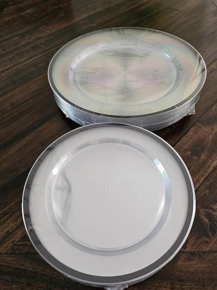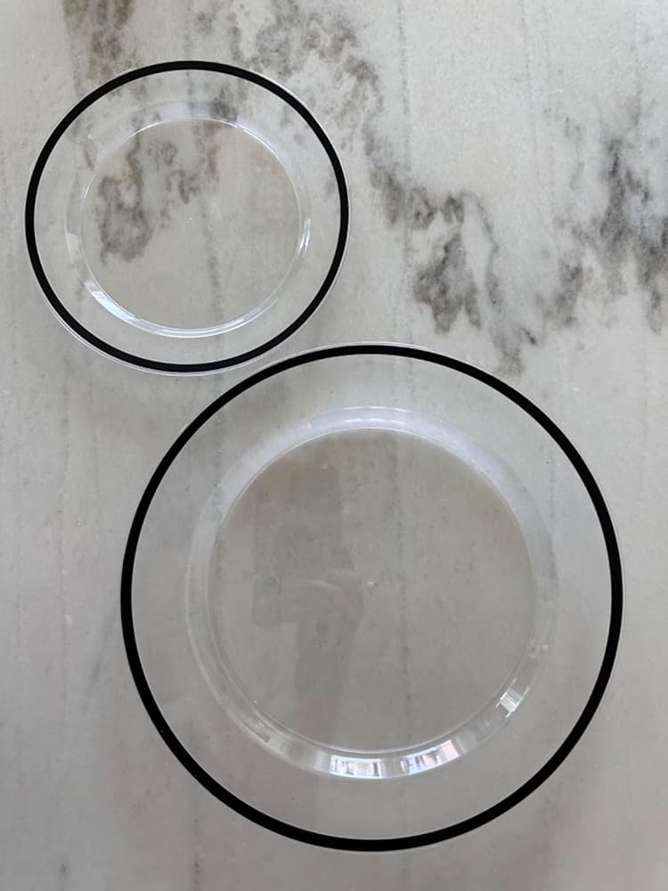 This is a simple yet elegant looking set of plastic plates. Who says the tableware has to look cheap because it's plastic. This takes it to a whole new level. the plates are a good size and are very durable. It almost feels like you could wash them and reuse. Looks great for special occasions such as birthdays, parties or a baby shower.