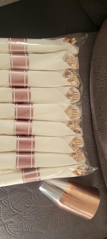 I ordered the rose gold for my daughter's bridal shower. Beautiful color and loved that it came as a combo where the knife, fork, & spoon were wrapped in the napkin. Received lots of compliments!