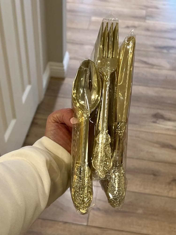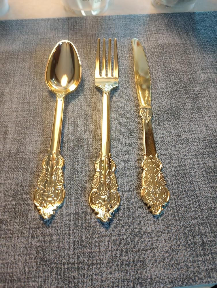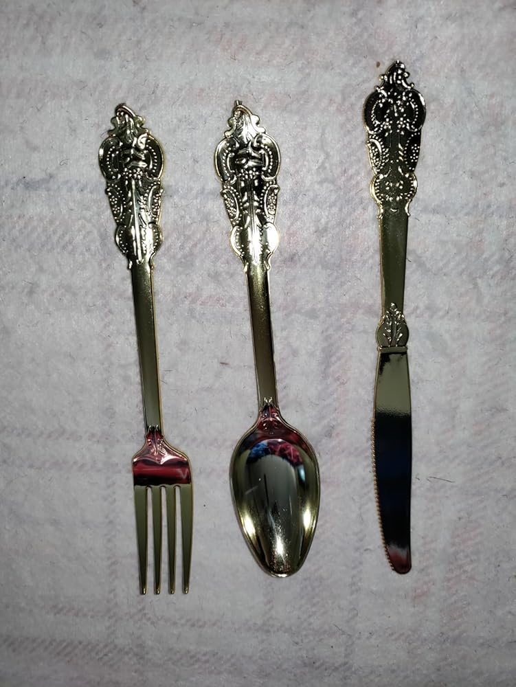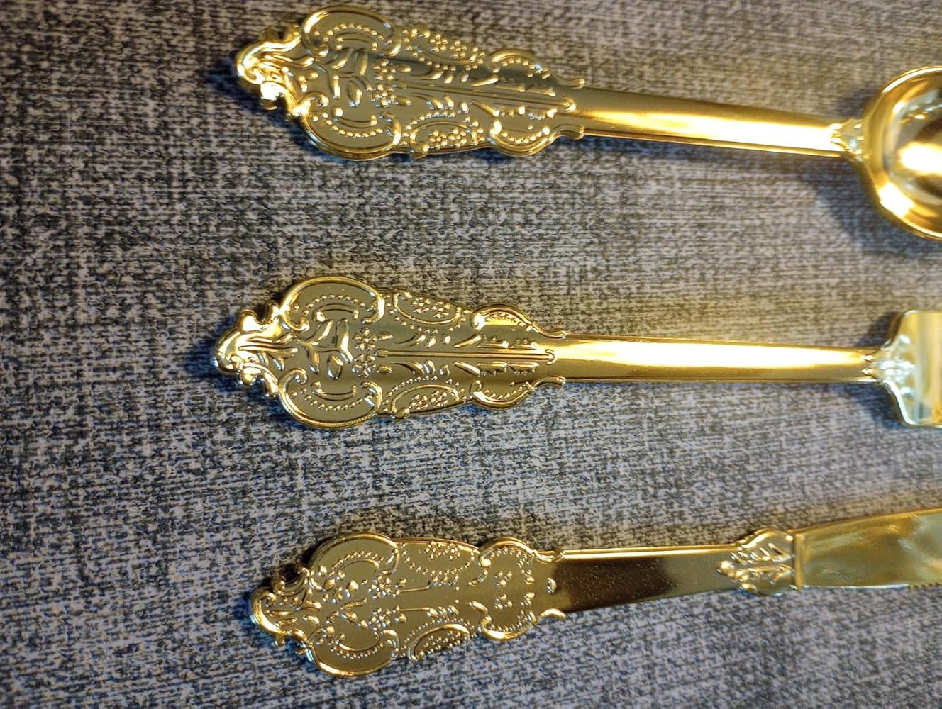 Stunning gold plastic silverware. They look like metal until you pick them up. I love the attention to detail on the handles with the added design. I'm excited to use these for my whimsical baby shower. I had to order another pack.