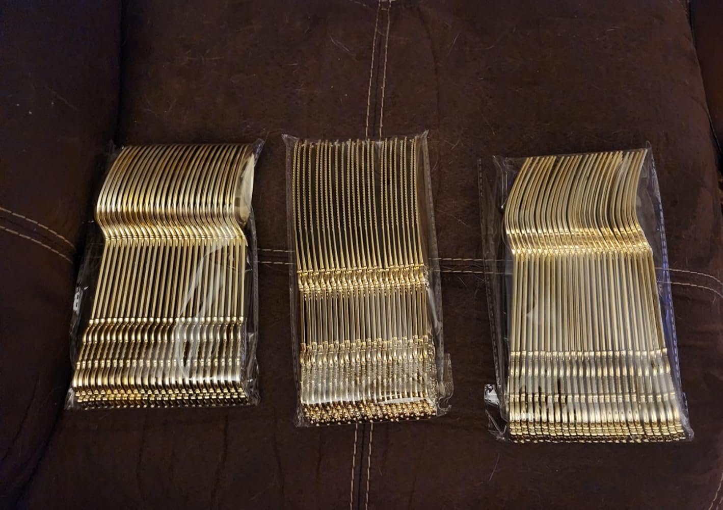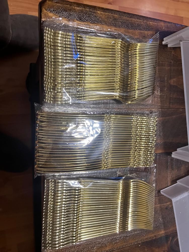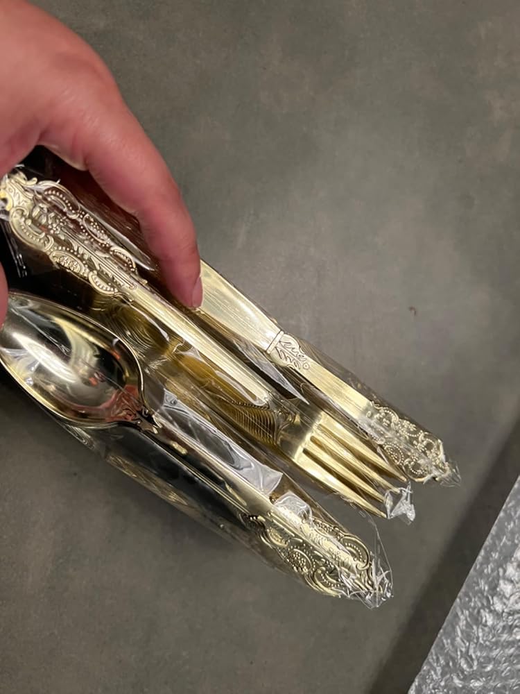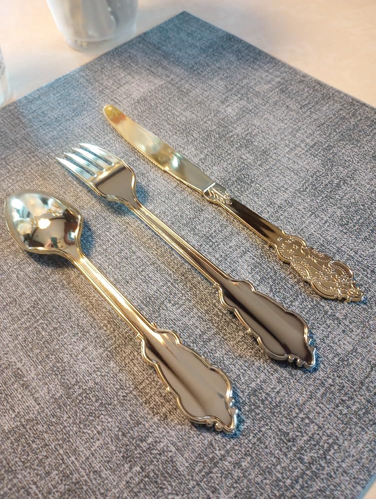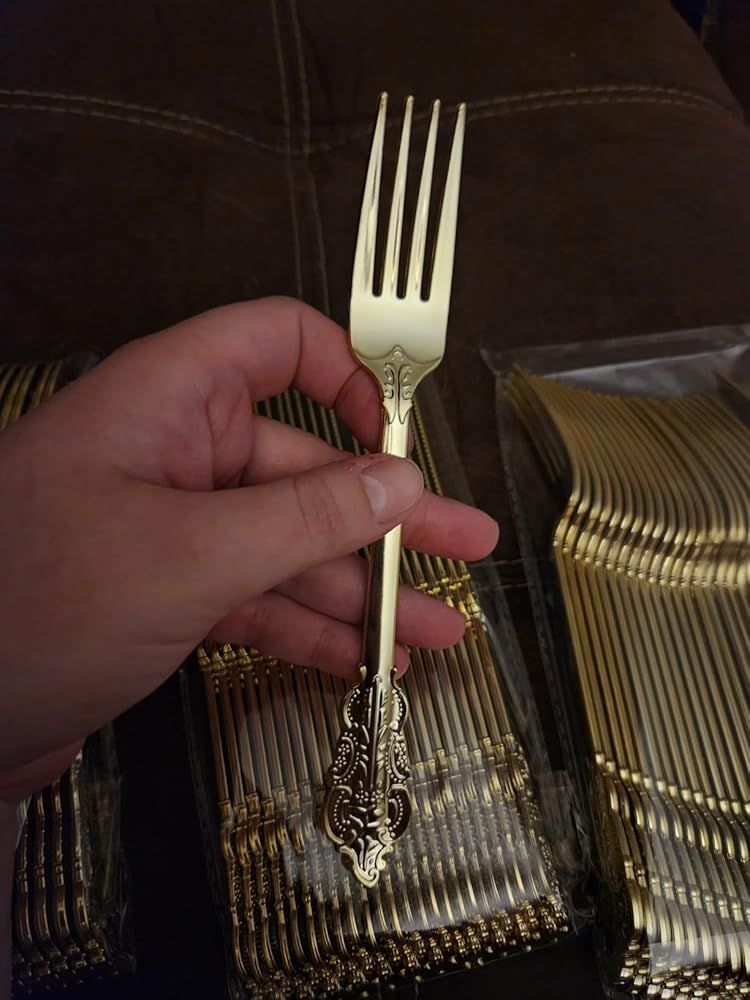 Stunning gold plastic silverware. They look like metal until you pick them up. I love the attention to detail on the handles with the added design. I'm excited to use these for my whimsical baby shower. I had to order another pack.