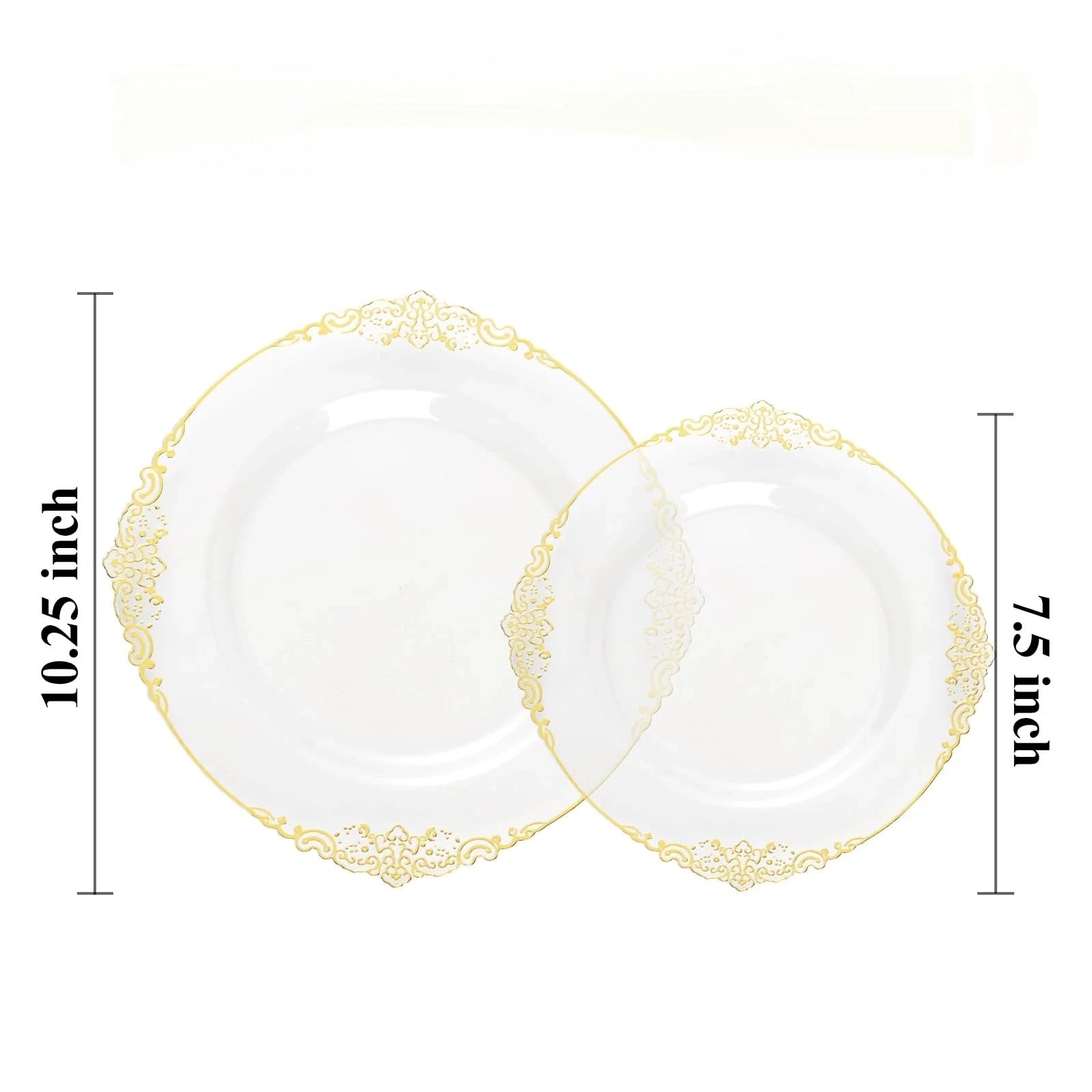 The 200 PCS Clear and Gold Plastic Plates are very stunning with their filagree designs in gold on the edges. Set comes with twenty- five dinner plates and twenty-,five cake plates.Plastic isn't thick, but will hold up nicely. They seem strong enough to make it through a few events.They look great.