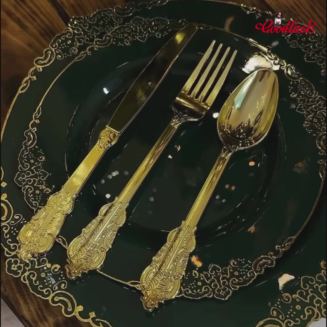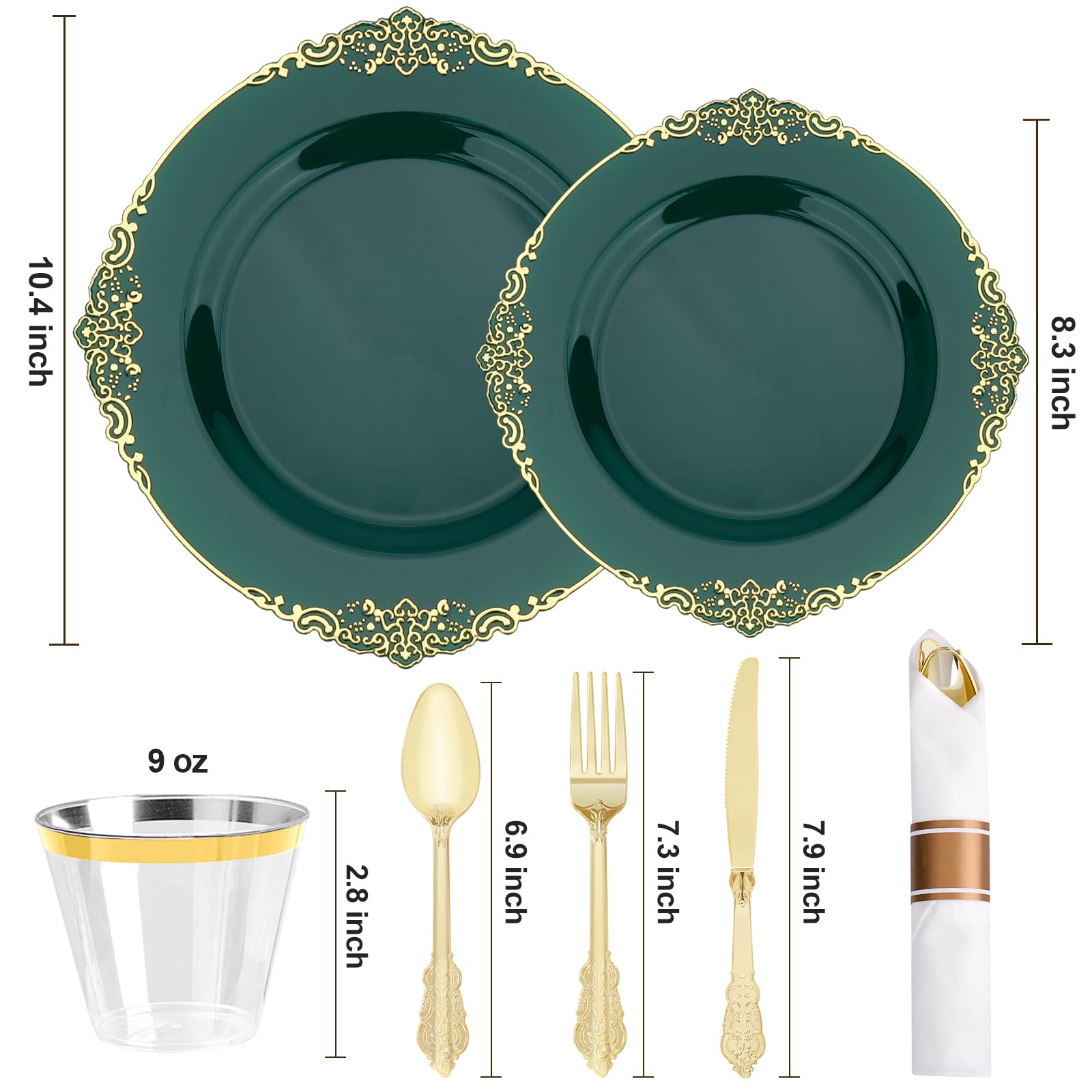 Goodluck 350 PCS Disposable Retro Green with Gold Rim Plastic Dinnerware Set