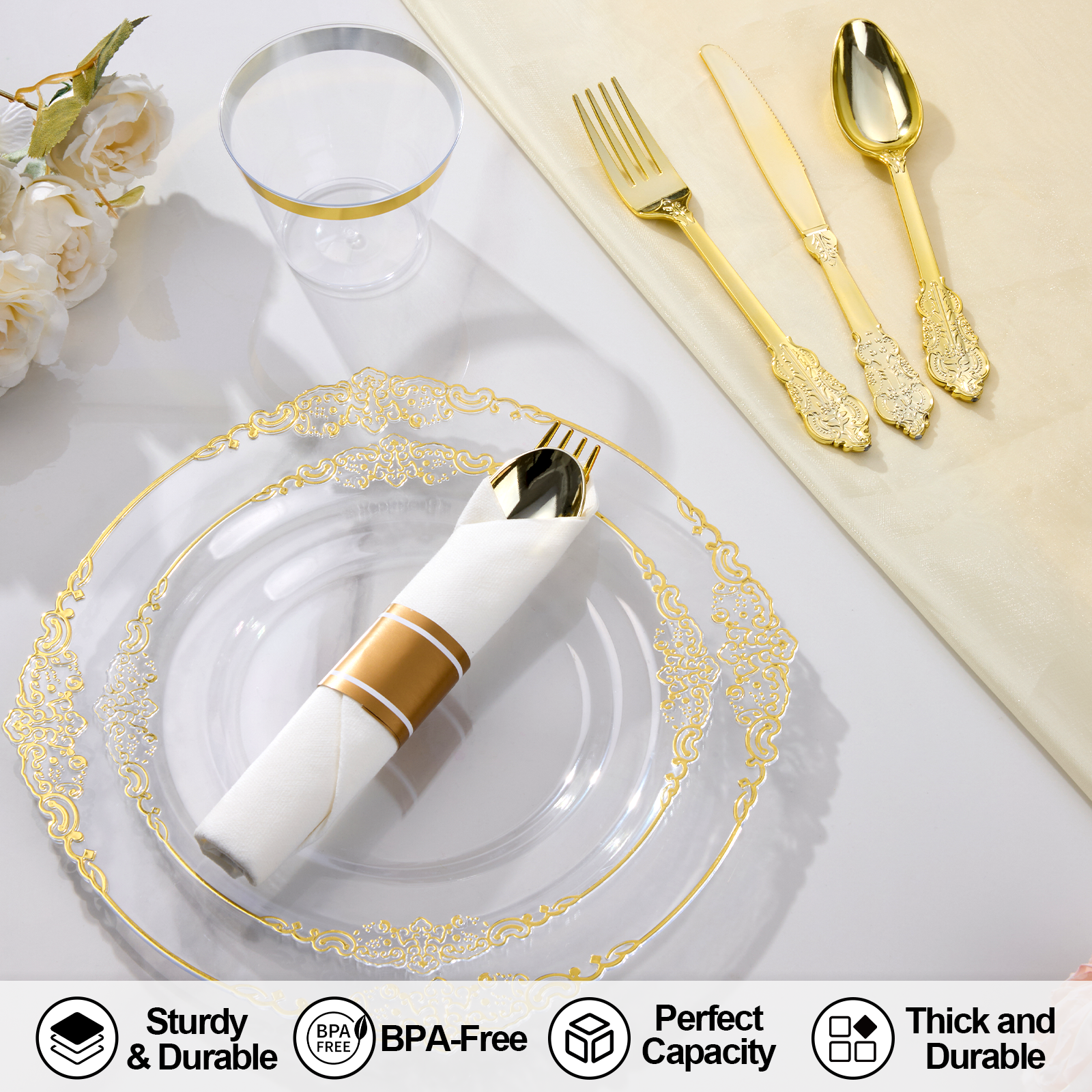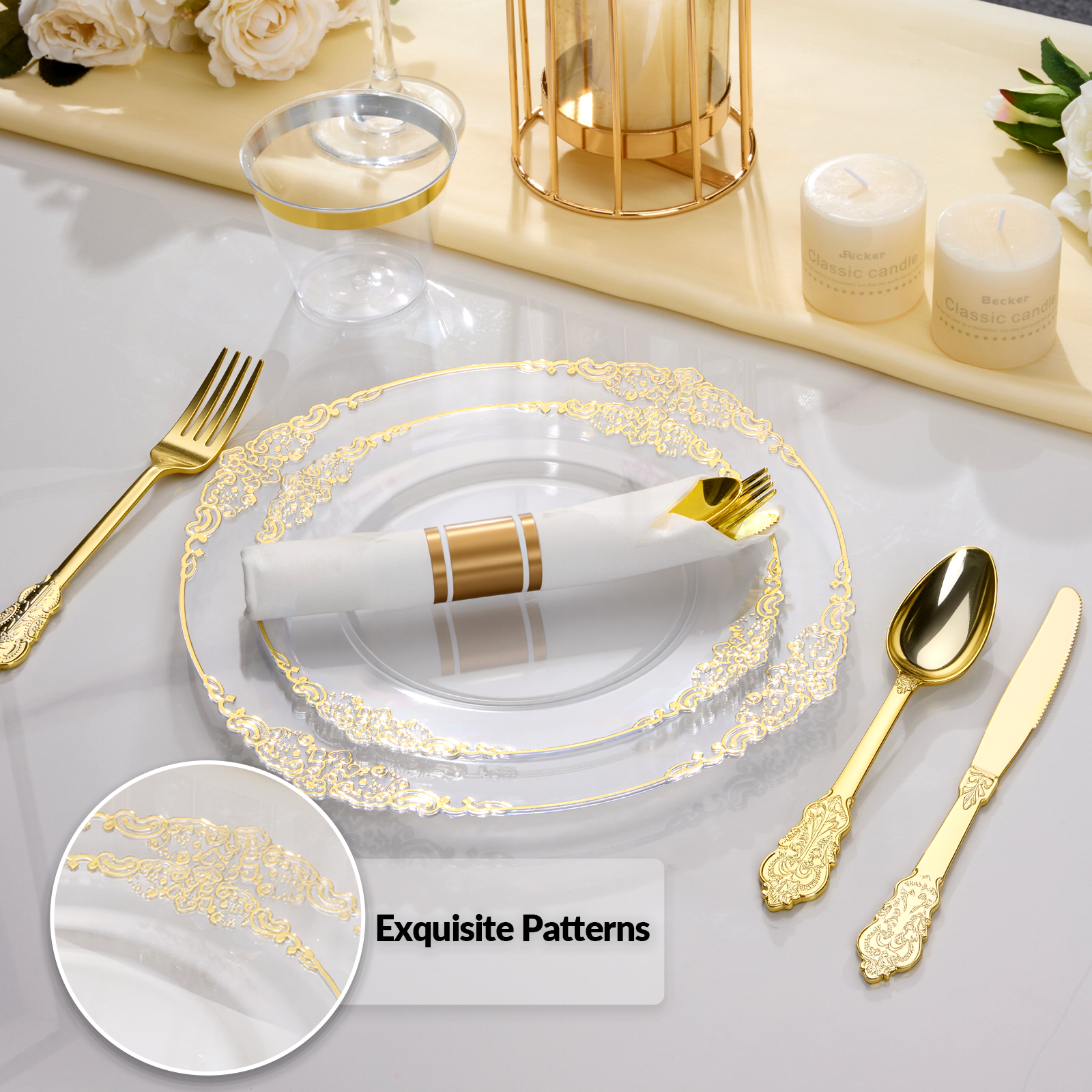 Goodluck 350PCS Disposable Clear with Gold Rim Plastic Dinnerware Sets for 50 Guests