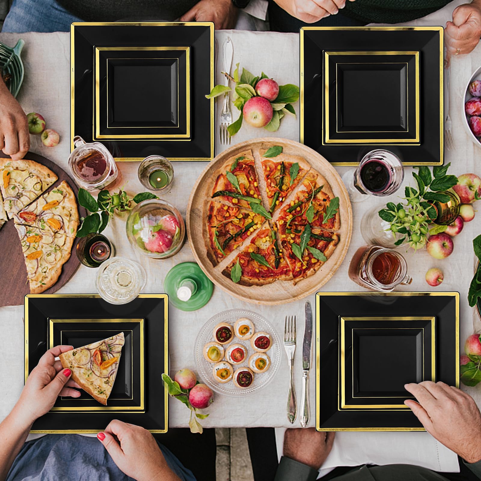Dinnerware Includes: 50 9.5" square dinner plates, 50 6.5" square salad plates, 50 rolled napkins, 50 9oz cups, 50 knives, 50 forks, 50 spoons, and 2 tablecloths
