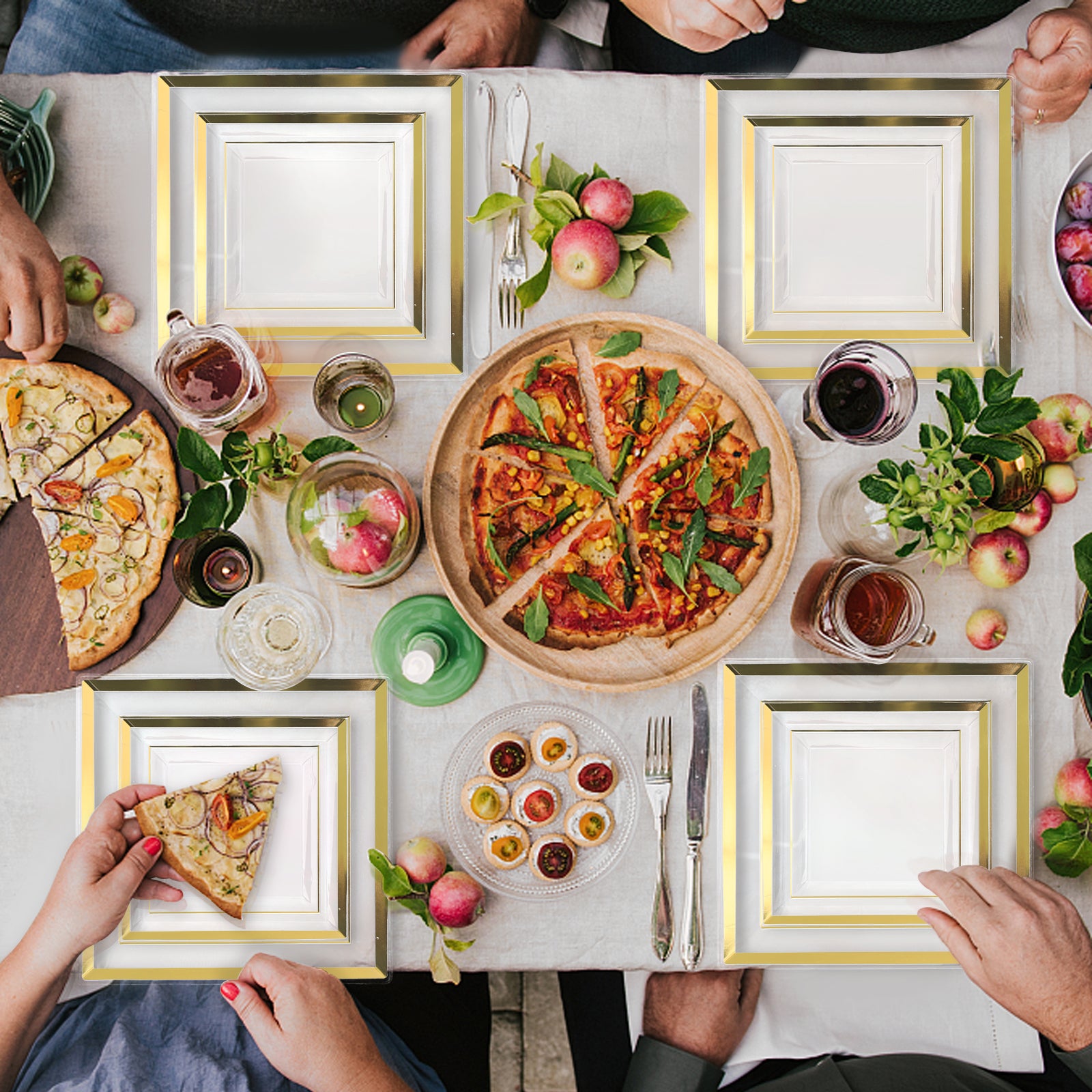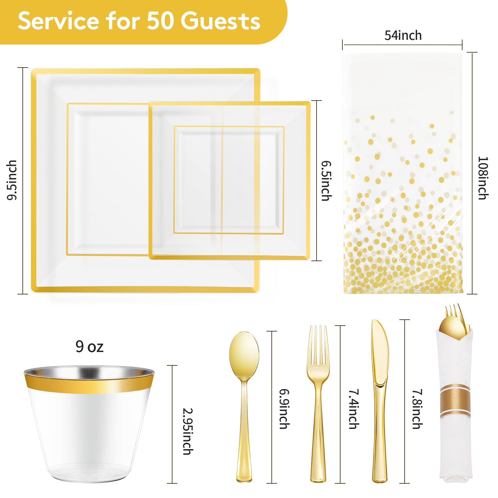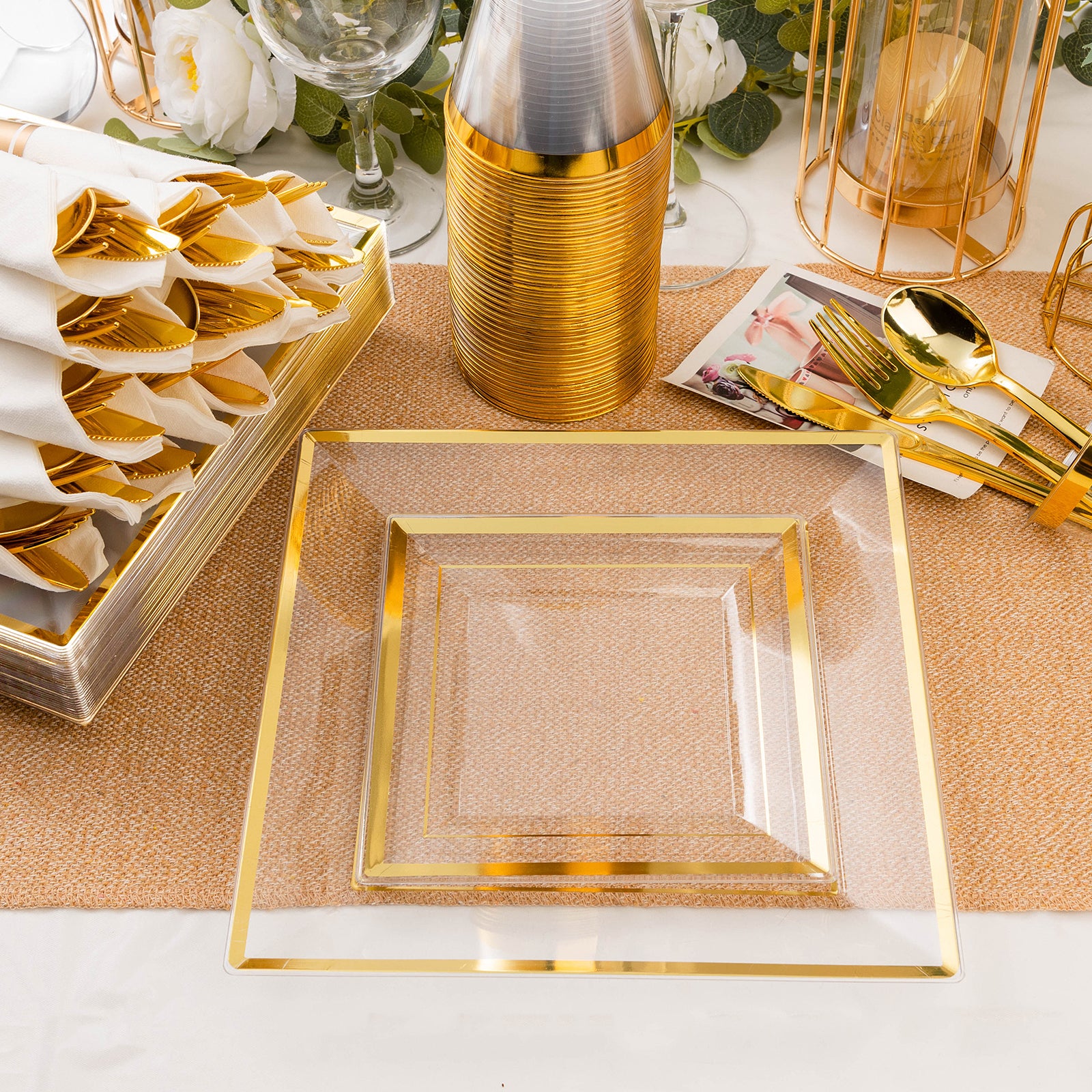 Dinnerware Includes: 100 Clear Square Plates with Gold Trim, 50 Rolled Napkins, 50 Cups, 50 Cutlery Set, and 2 Tablecloths