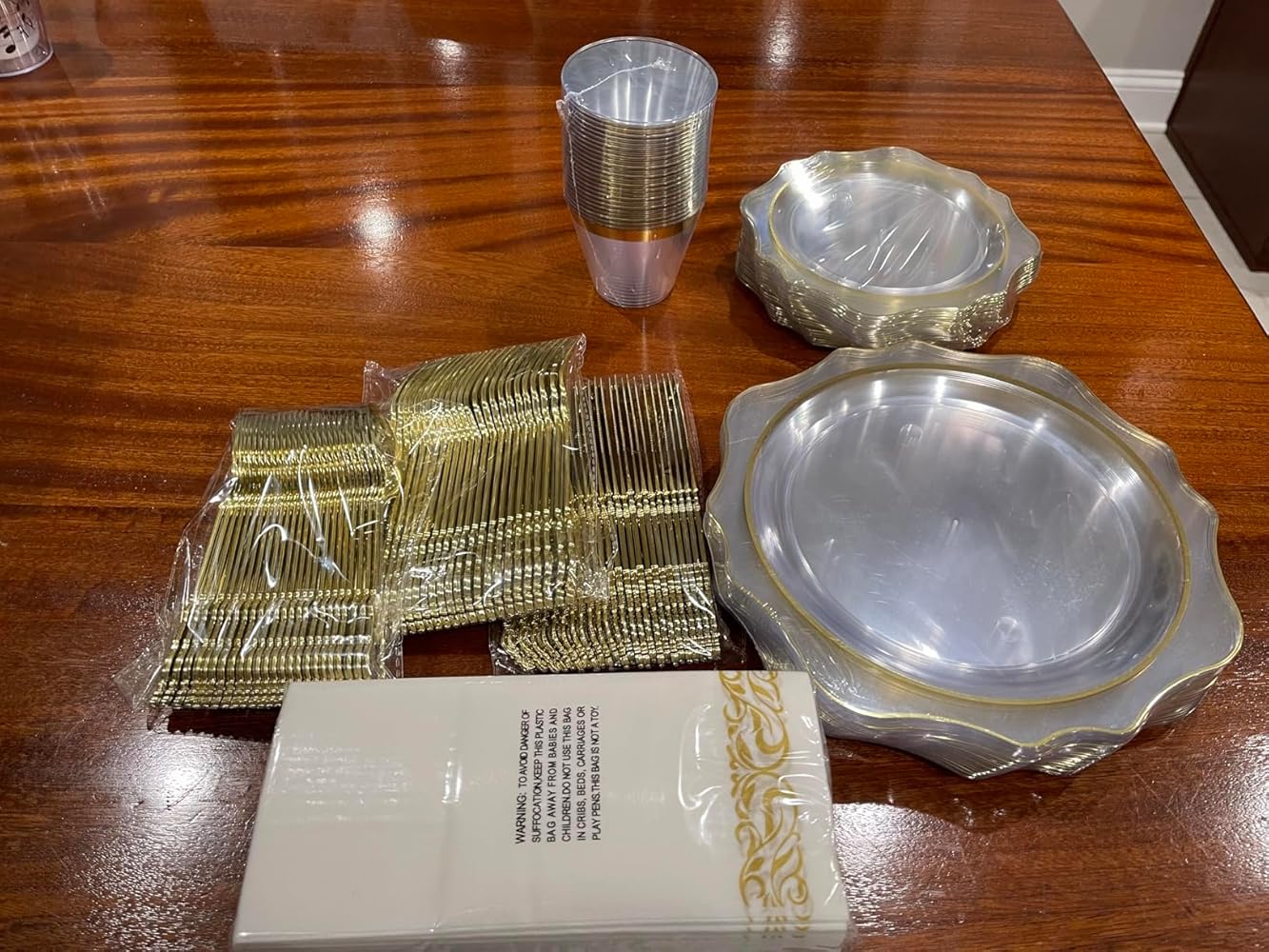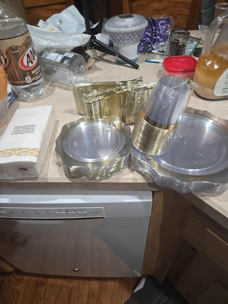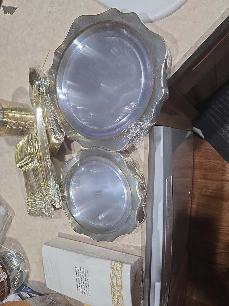 This is such a great set to have on hand for parties and holidays. We like using disposable options that still look elegant and this one checks all the boxes. The plates are sturdy and hold up well. The dinner plates could be a little bigger but the quality makes up for it.The silverware looks really polished and feels more like actual utensils than your average plastic set. Everything arrived intact with no cracks or breaks. The cups are small so I used them for fruit and veggie cups which worked great for appetizers.One thing I was especially happy with is the napkins. They��re not flimsy or papery at all. They��re thick, soft, and feel more upscale which adds to the whole presentation. For the price and quantity, this set is a fantastic value. I��ll absolutely be ordering again.