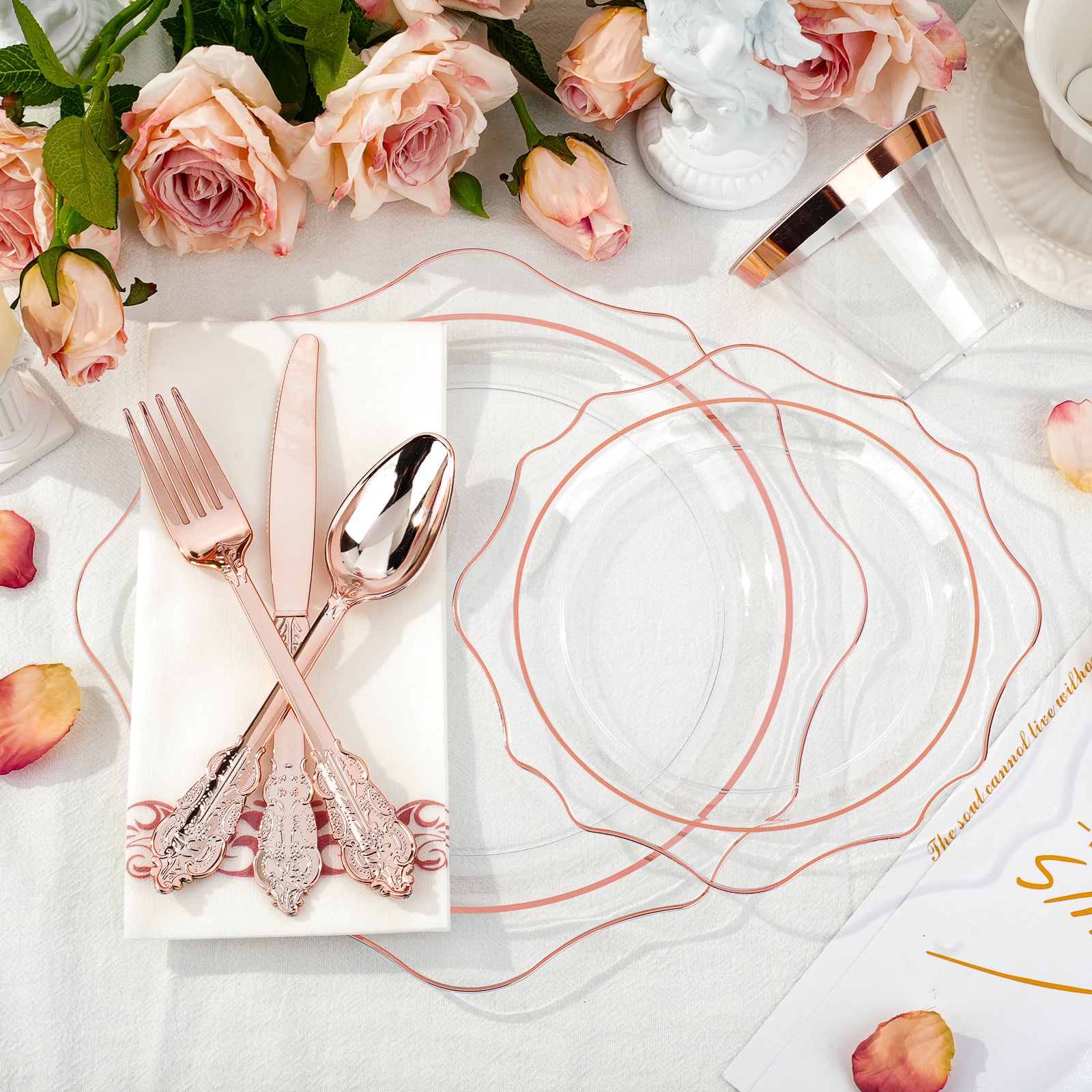 Goodluck 350 PCS Disposable Scallop Clear and Rose Gold Plastic Dinnerware Set for 50 Guests