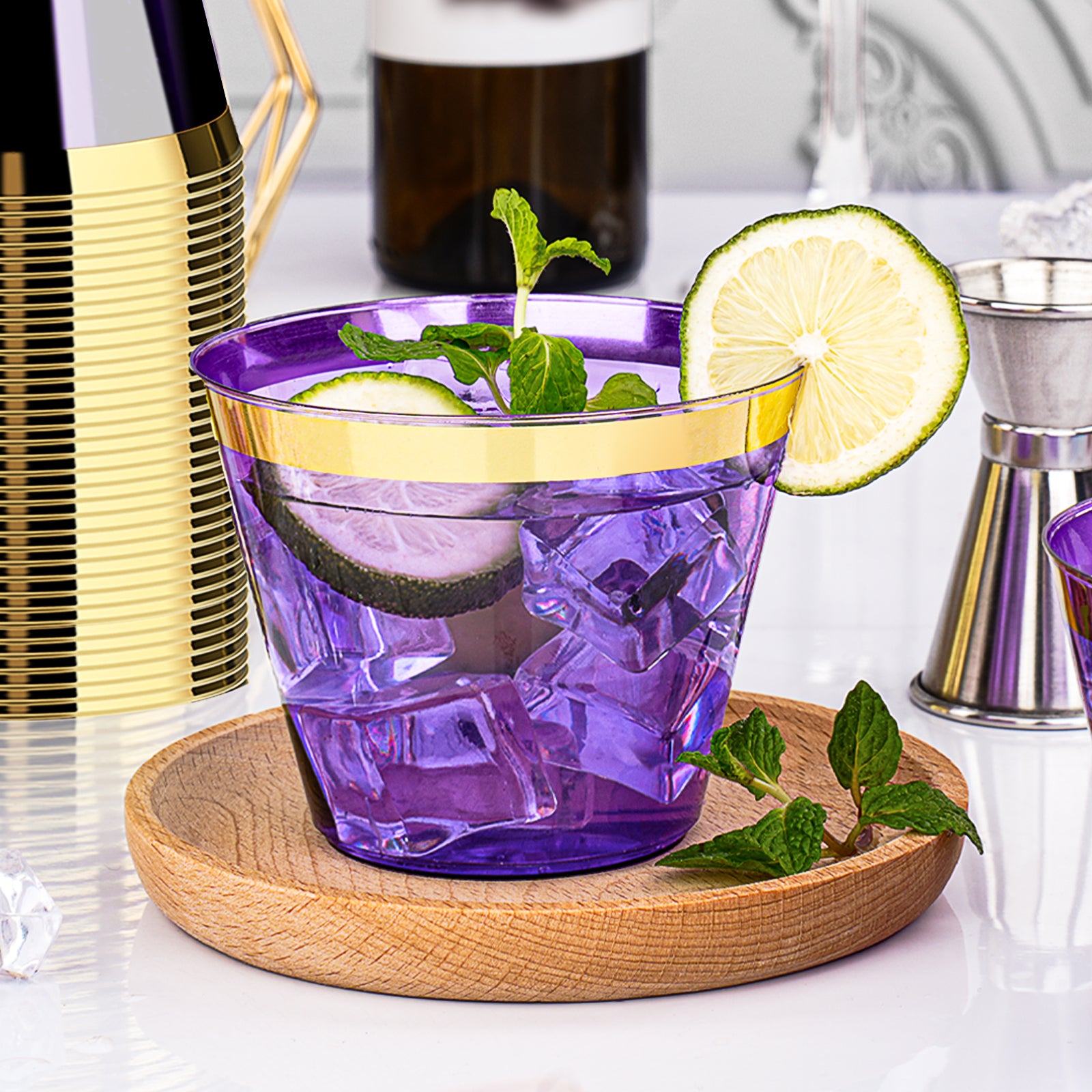 Goodluck 100 Pack 9 oz Disposable Purple with Gold Rim Plastic Cups for Party & Graduation & Wedding