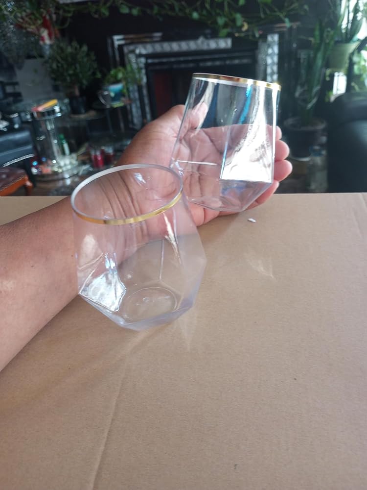Adore these cups!!! They are thick and durable, beautiful design, and look like real glass! I love the shape and the gold rim makes them look extra fancy! Fun to use for everyday drinks to feel fancy or for a party. Great set!!