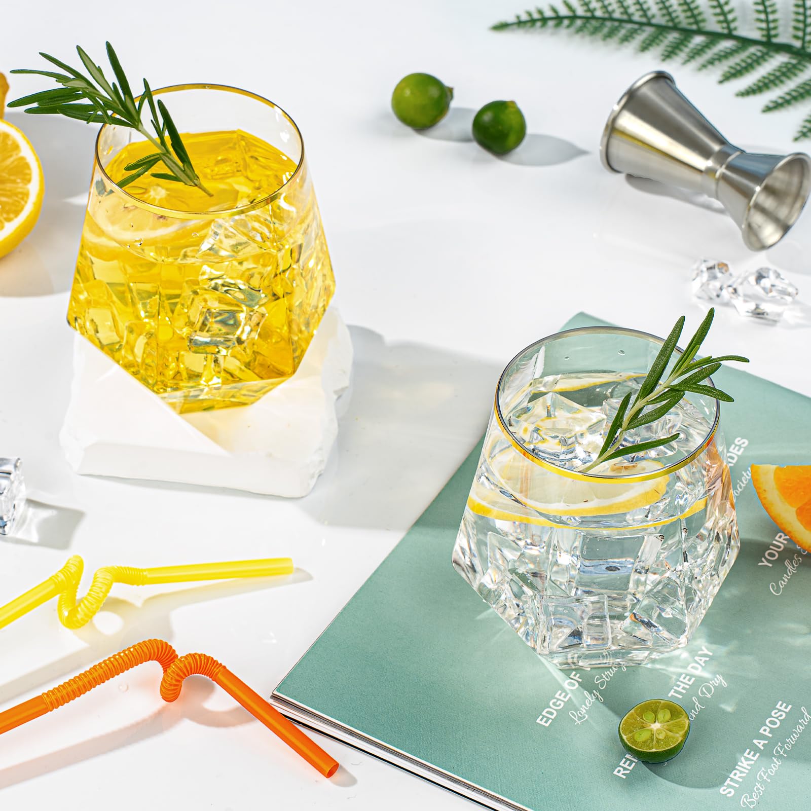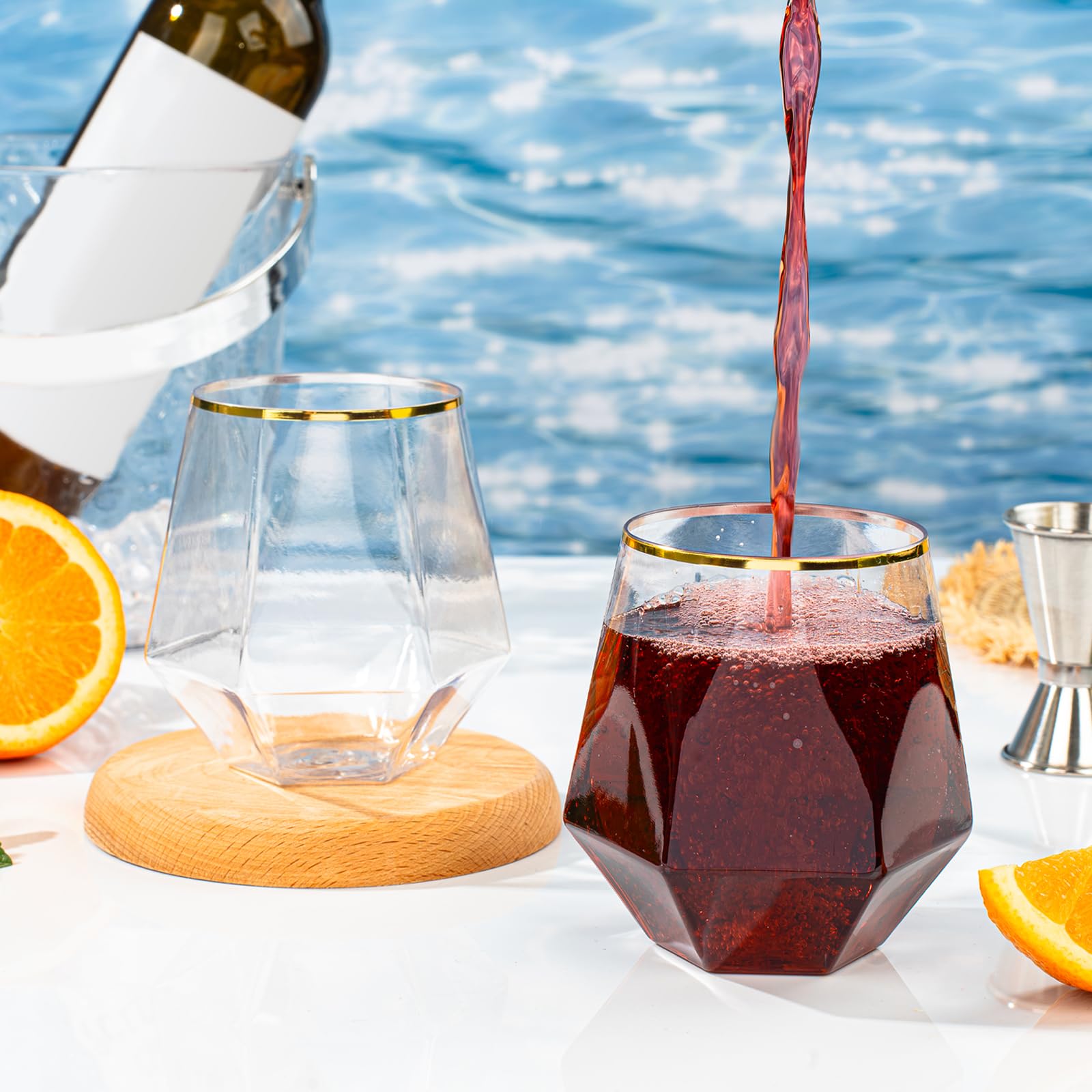 Goodluck 40 Pack 12 Oz Diamond Stemless Plastic Wine with Gold Rim Glasses for Whiskey or Cocktail