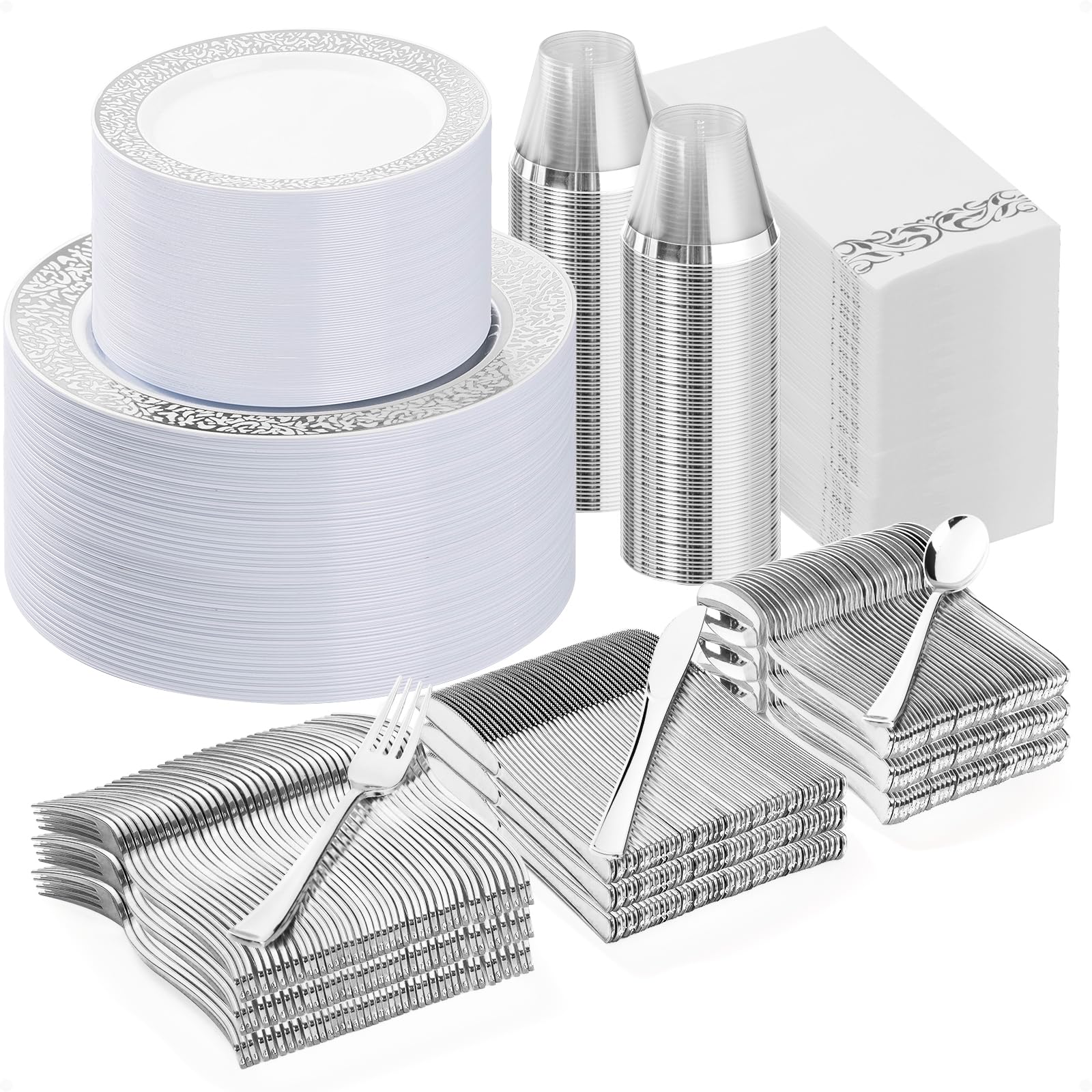 Goodluck 700PCS Disposable Silver Plastic Dinnerware Sets for 100 Guests