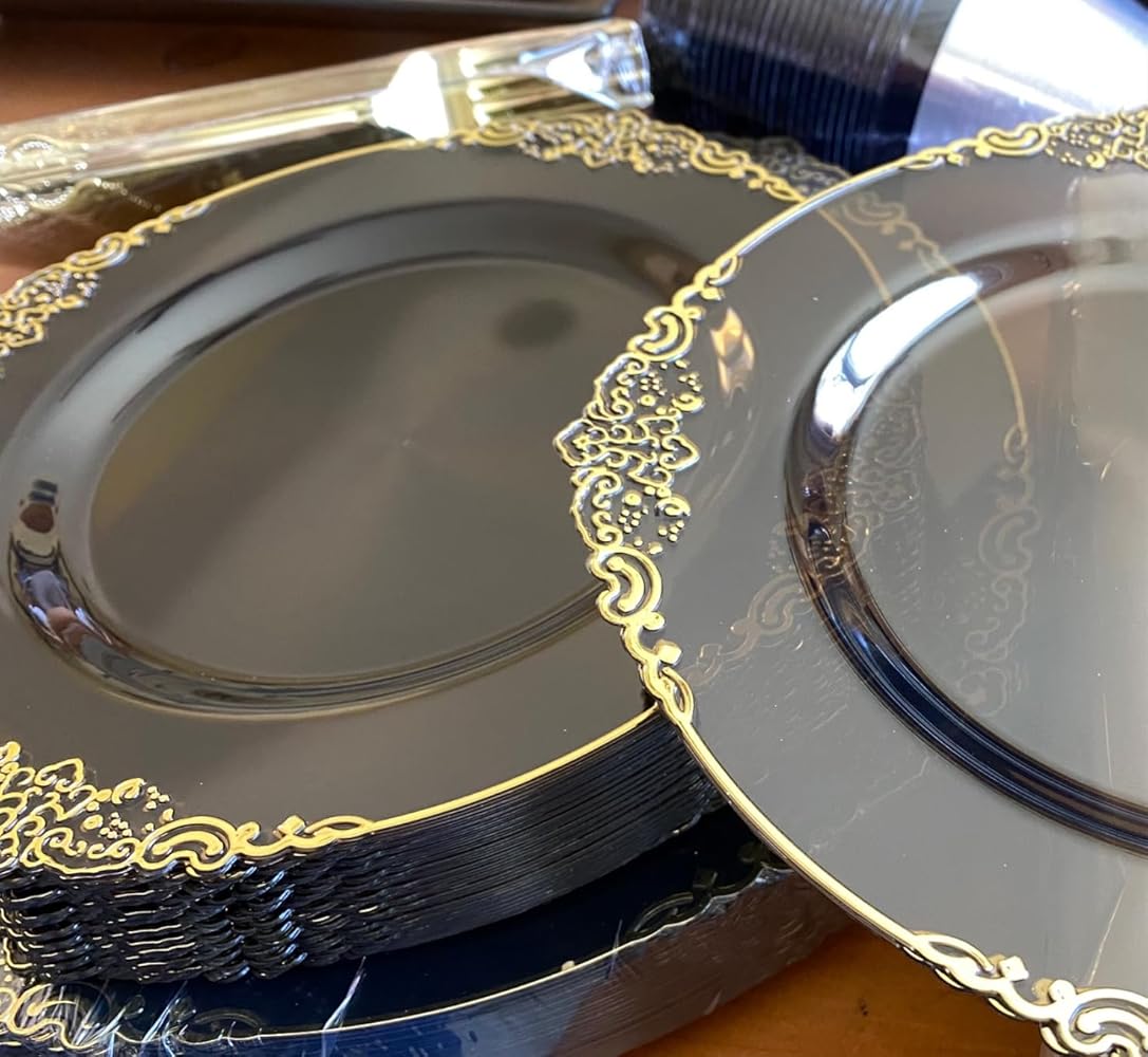 I recently hosted a large family holiday meal at my house. I wanted the tableware to look nice, but didn��t need the hassle of washing dishes afterward. I would rather spend my time visiting with my relatives, than cleaning. Thought this complete set looked really nice. Although made of plastic, the gold looks so shiny that It gives the entire set an elegant glow. The sellers photo gives an excellent description of what you receive. Sadly in my set, they did not send me the black cups with gold rims. Instead, I got clear cups with black rims, which honestly look awkward. Be aware that the plates are not solid black; they are a clear Smoky Gray. The set is quite durable and can handle meat and hot items.