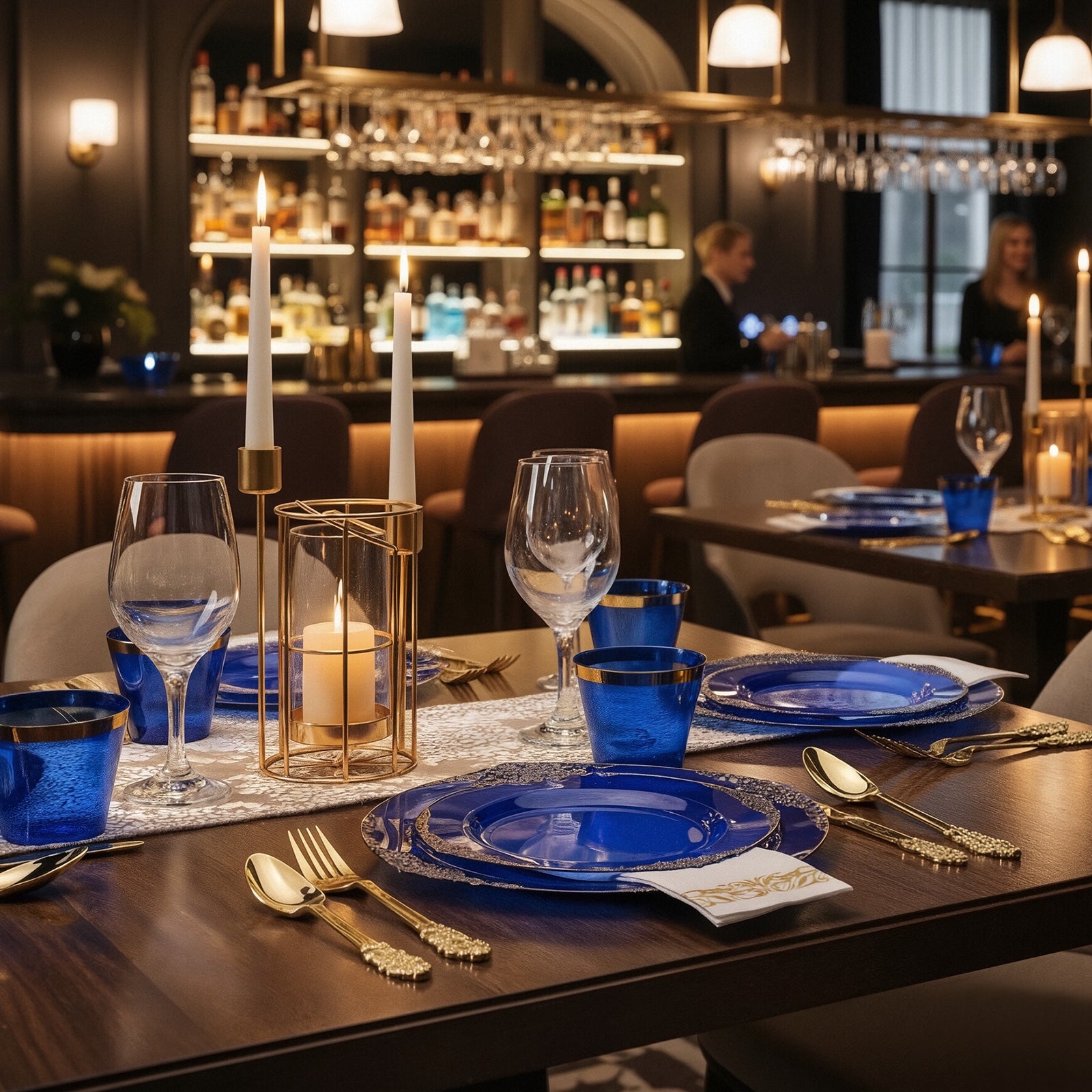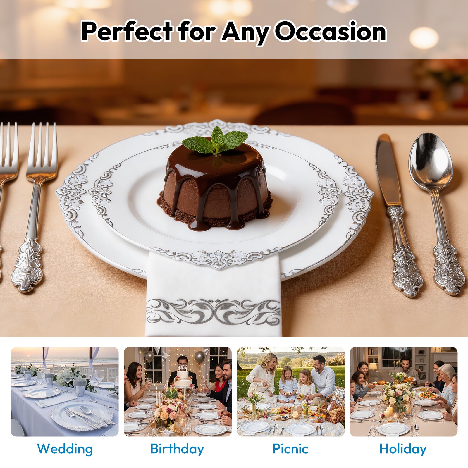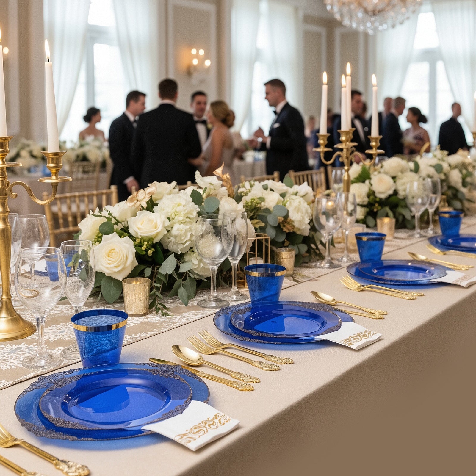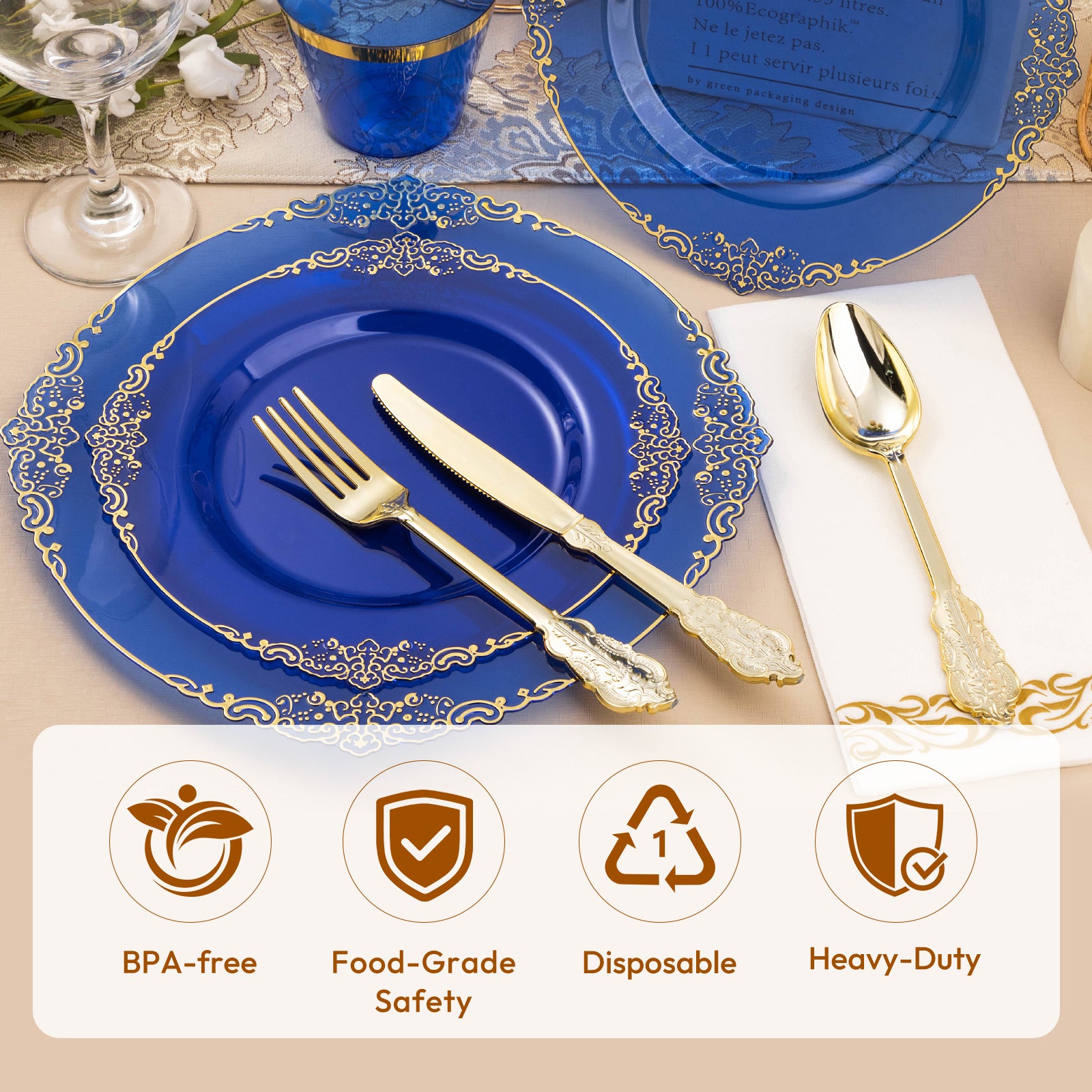 This 25 guest disposable tableware is excellent quality, especially the plastic is plates and cups! They're thick and sturdy with a nice elegant design. The plastic silverware also has a elegant design but could be better in quality. I do like the contrasting colors between the blue and gold. The napkins are dinner size, so nice and big, that absorb quite a bit. These can be used for a variety of different events, like weddings, graduation parties, baby showers, bridal showers, etc. They will make everyone ask where you got them and compliment them as well. Overall, I'm very happy with this product and feel like their worth the money!