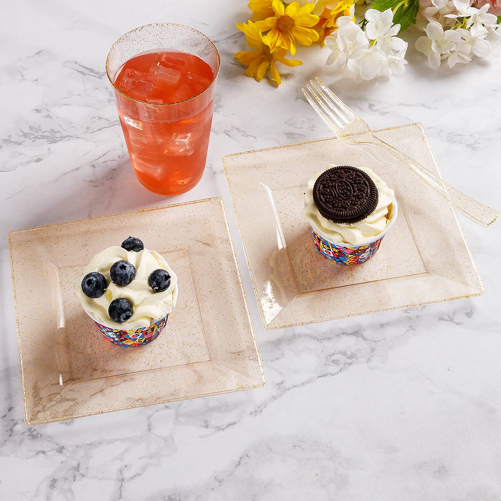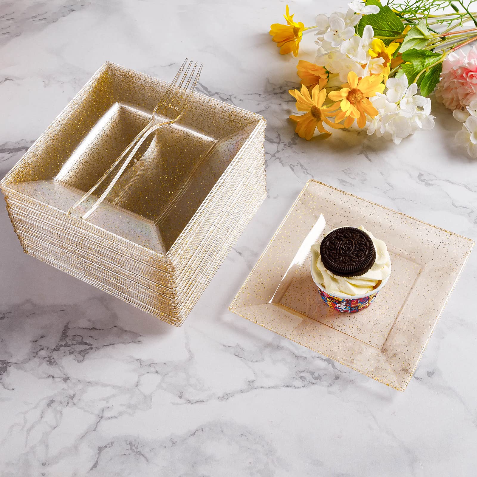 Goodluck 240PCS Square Gold Glitter Dessert Plates with Forks for 120 Guests