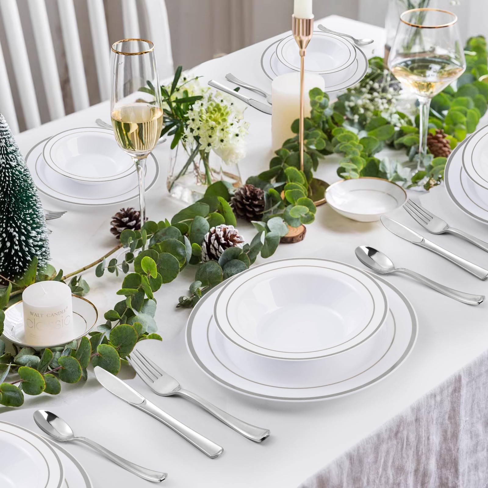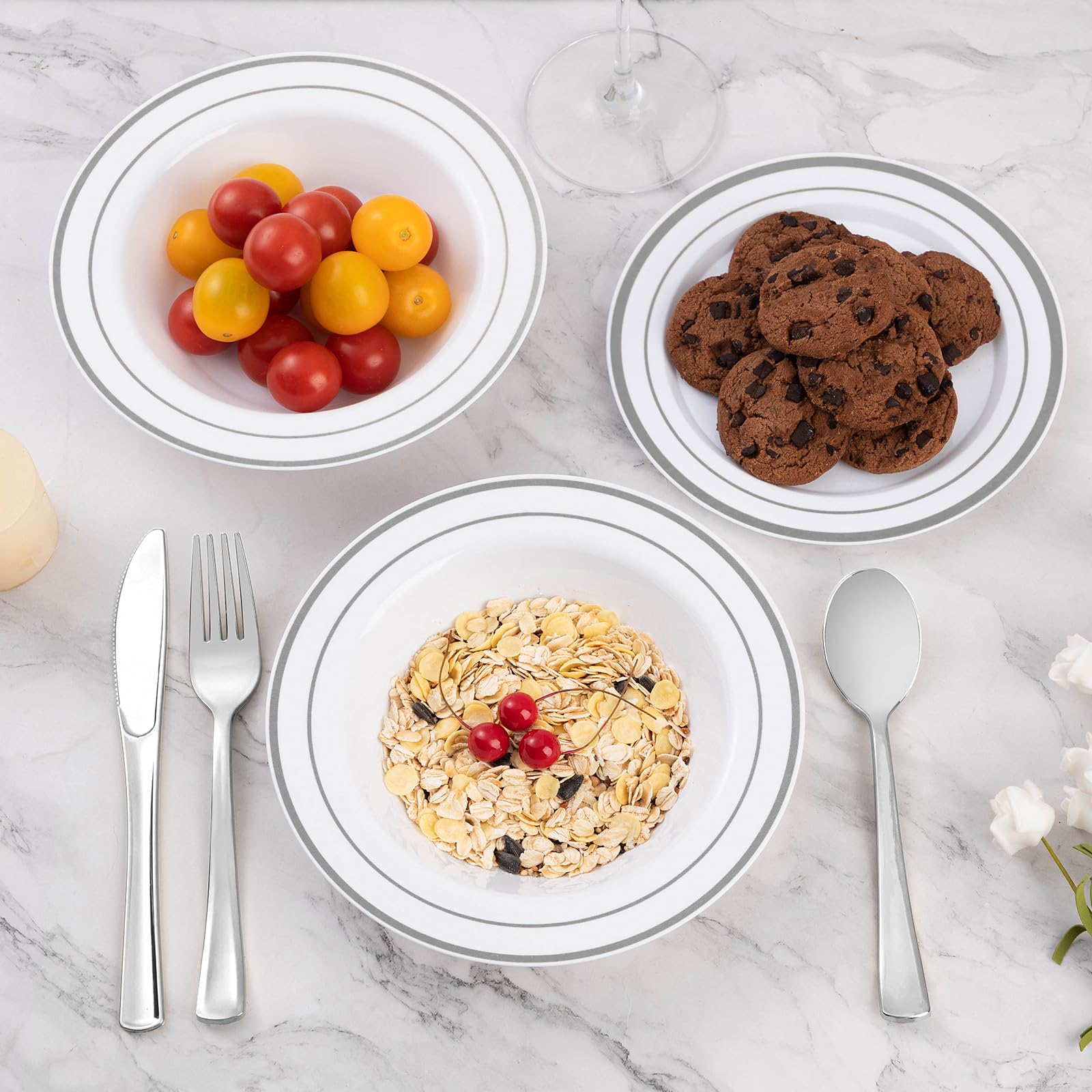 Goodluck 100 Pack 12oz Disposable White with Double Silver Rim Plastic Bowls