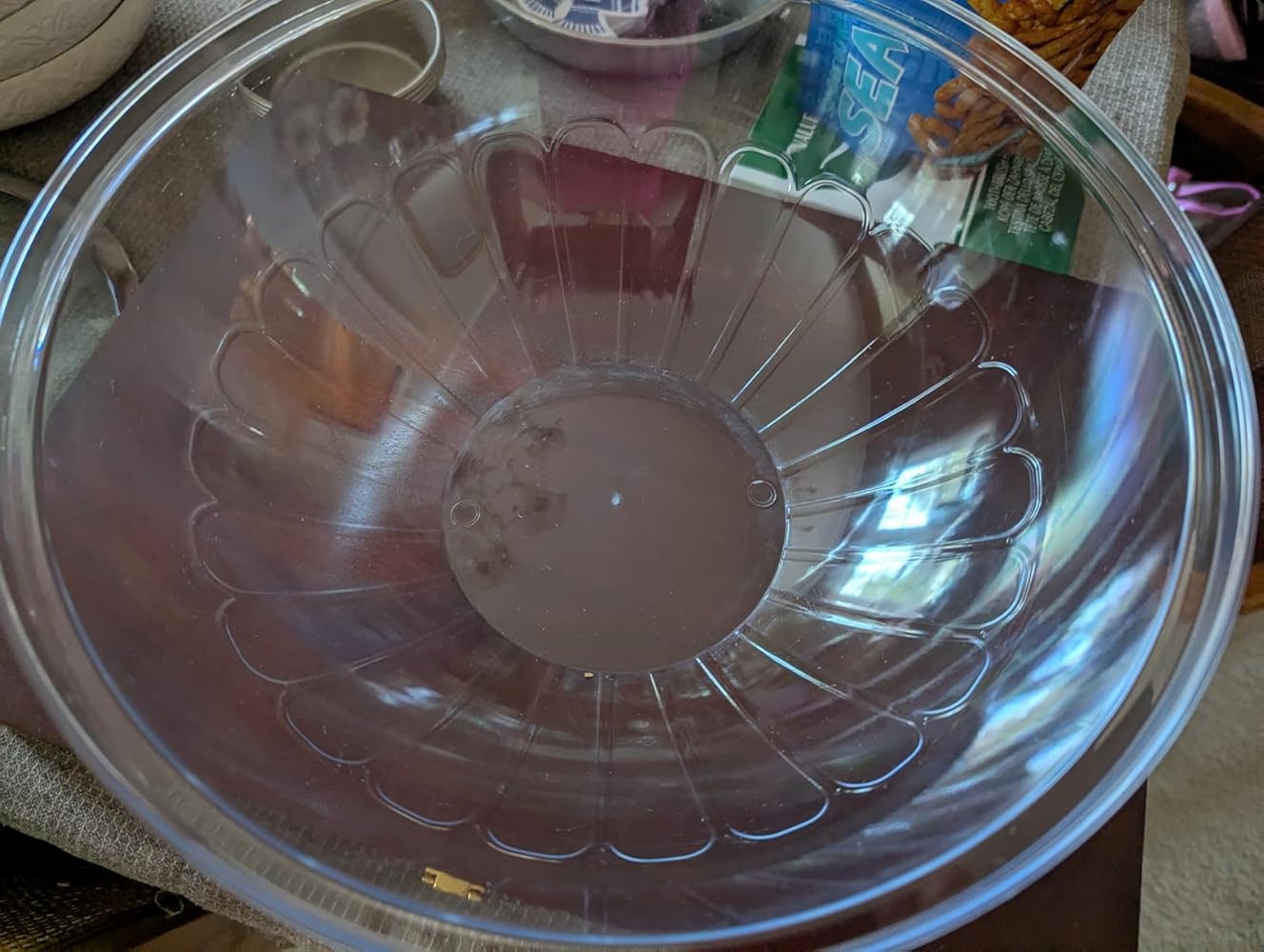 These 150-ounce clear plastic serving bowls are indeed very large, making them quite suitable for serving items like chips, salads, candy, and snacks at parties, weddings, or other events. The fact that they're disposable and stackable is convenient for cleanup and storage. You get a good quantity in the pack, which makes the price feel okay. However, they are a bit thin, so while they're fine for lighter items like chips, I don't expect them to last for repeated use. They're definitely more of a one-time party solution in my opinion. One drop on the floor and I feel like they would crack but works for what I need it for.
