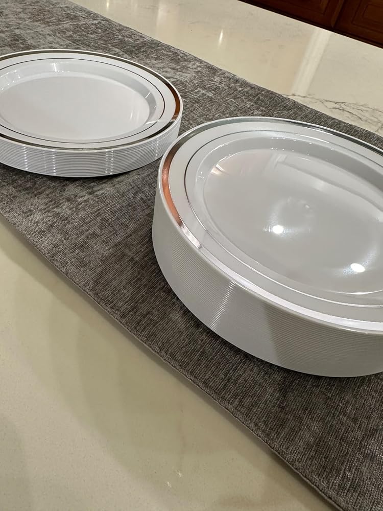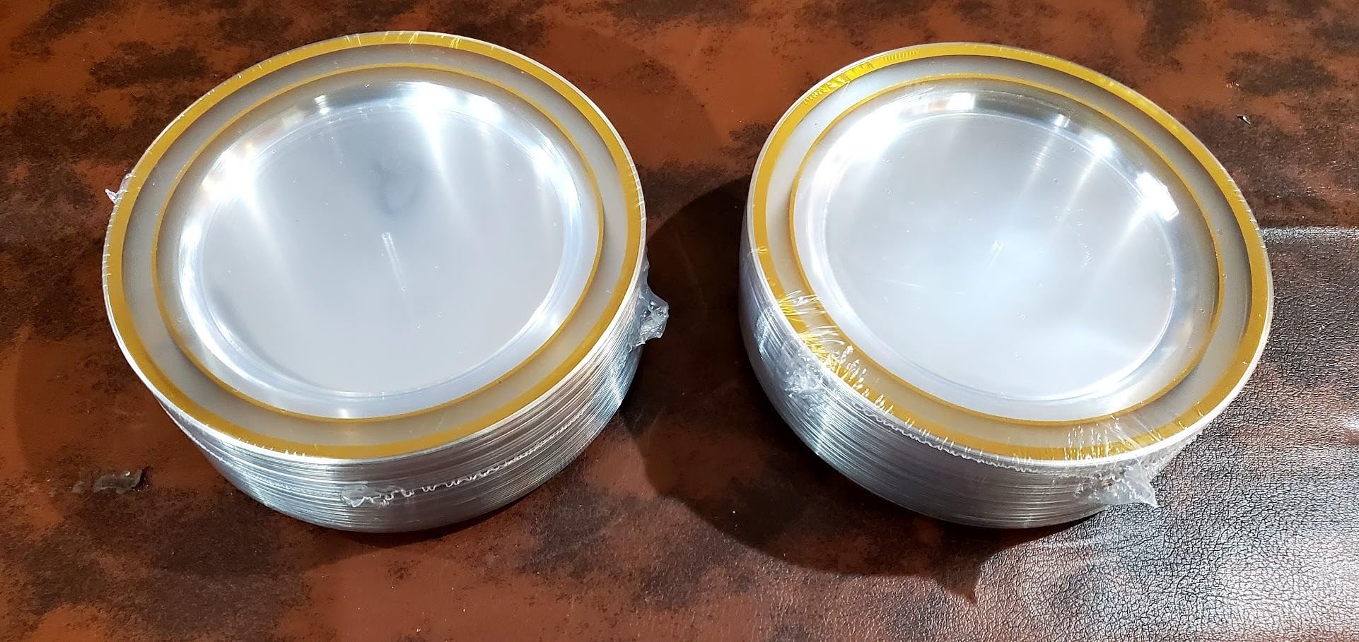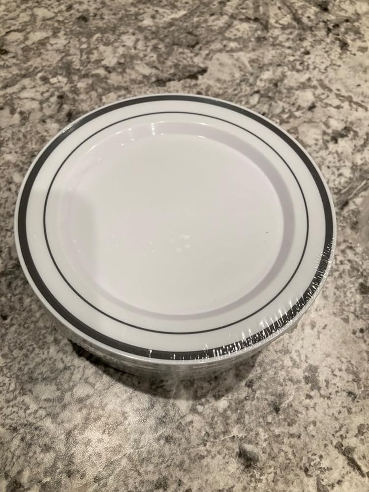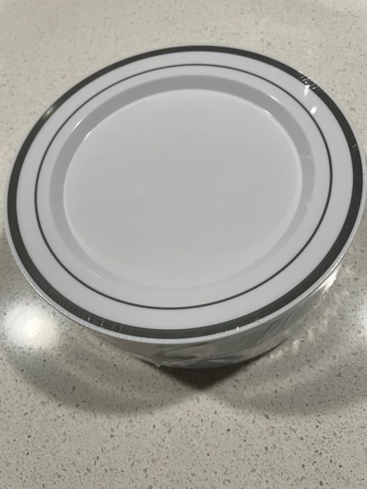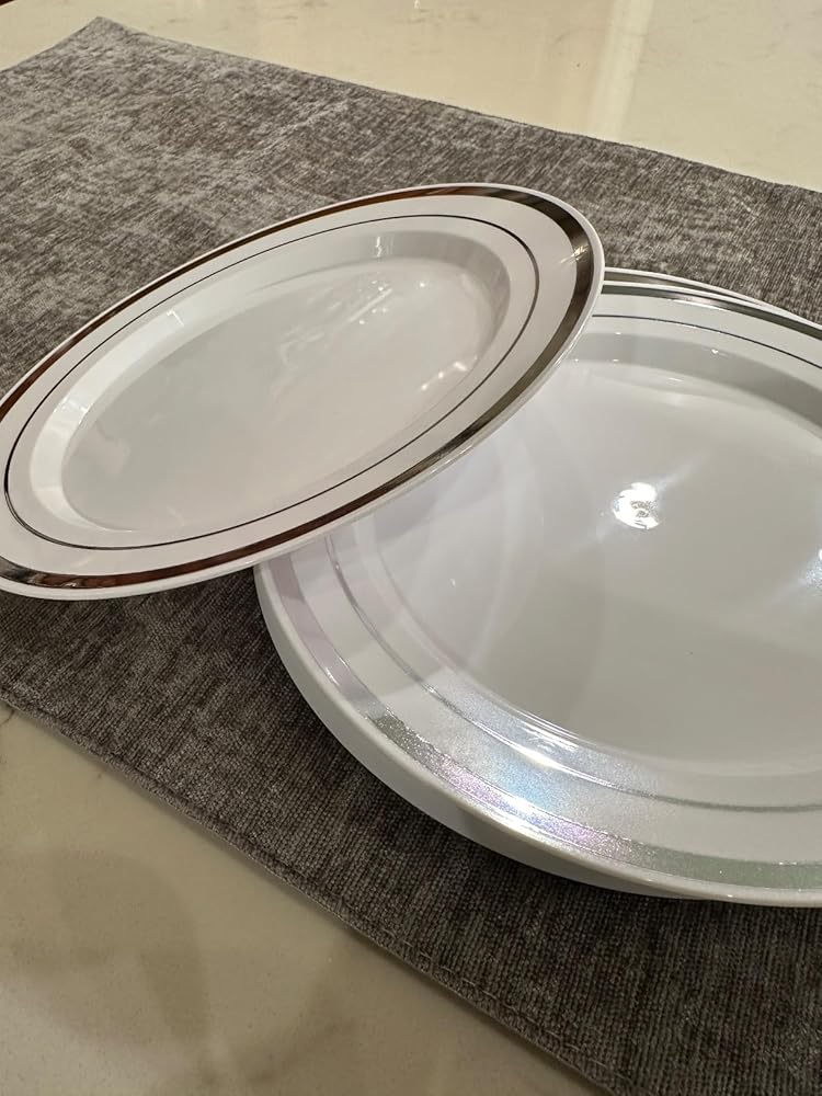 I love these plastic disposable plates. They are great to always have in the kitchen. The plates are super durable. They are also elegant with the silver rim. They are perfect desert plates for parties, birthdays or any gathering. These are great for small meals. I used one for lasagna. A must have.