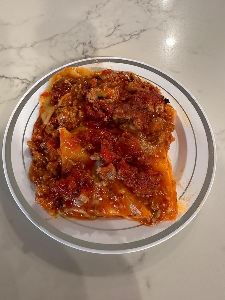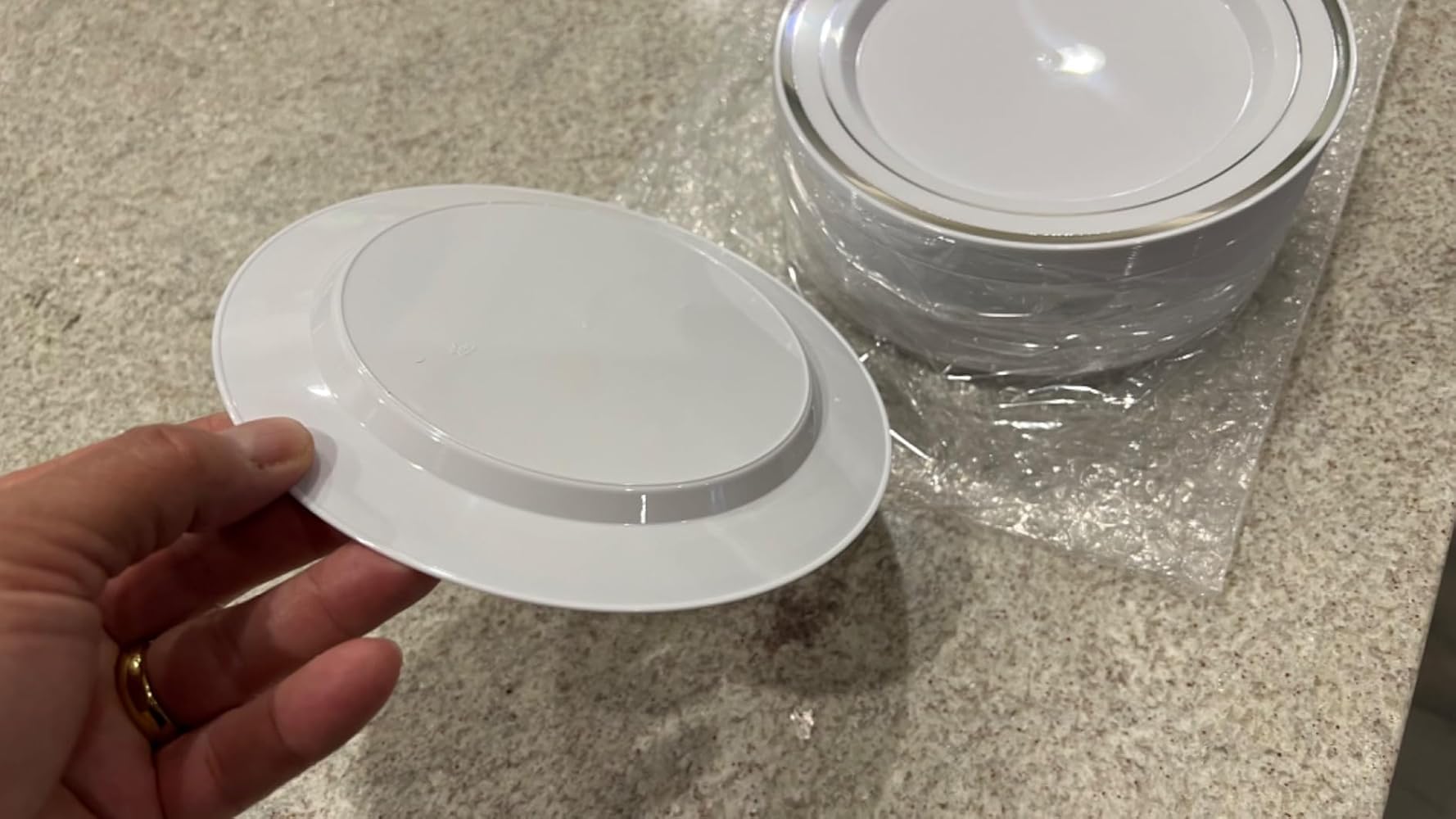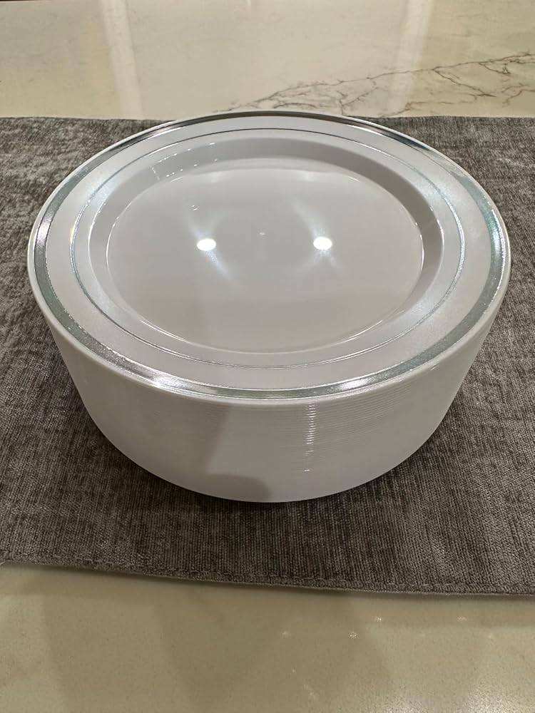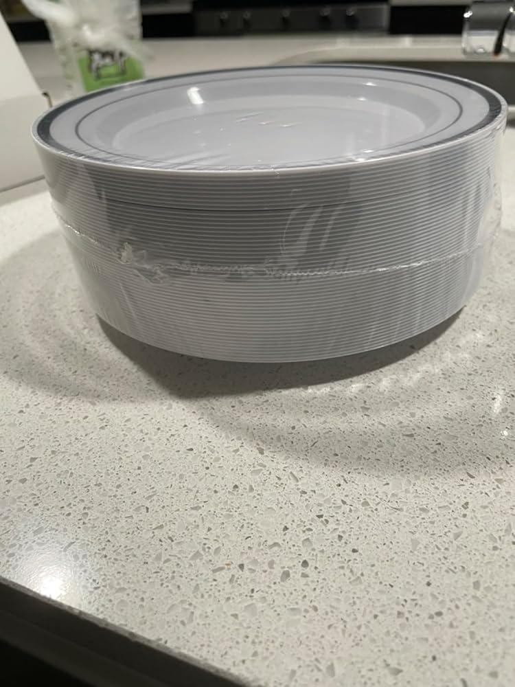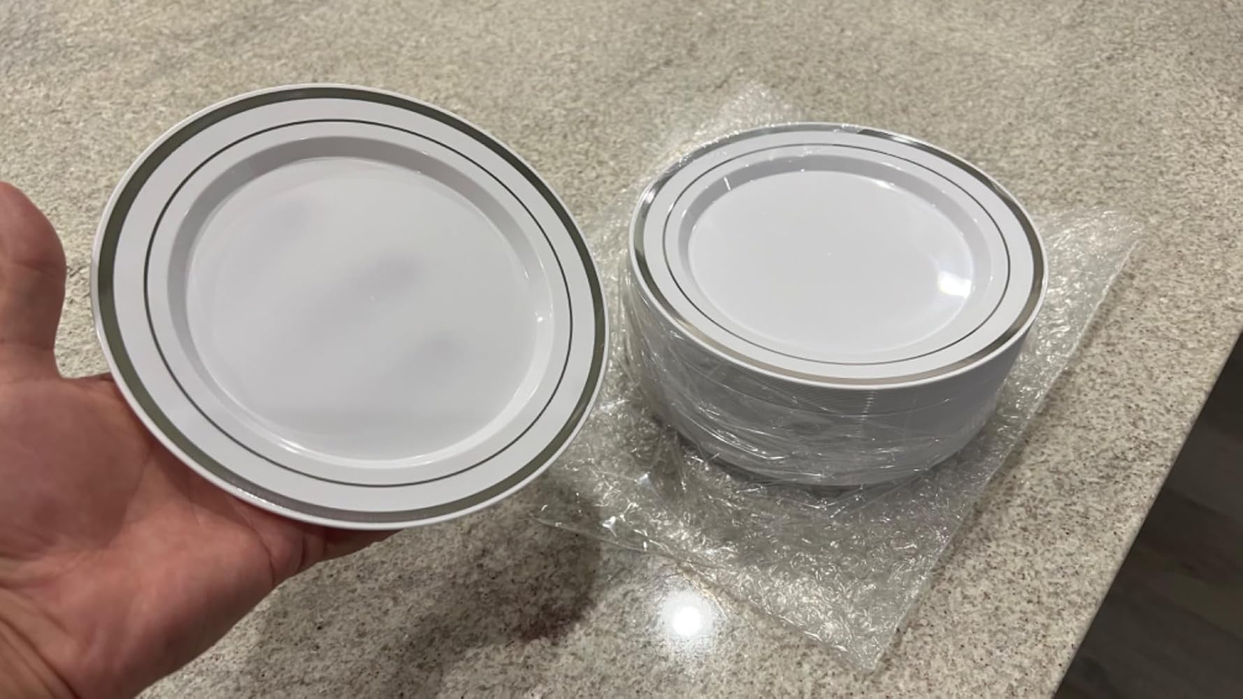 I love these plastic disposable plates. They are great to always have in the kitchen. The plates are super durable. They are also elegant with the silver rim. They are perfect desert plates for parties, birthdays or any gathering. These are great for small meals. I used one for lasagna. A must have.