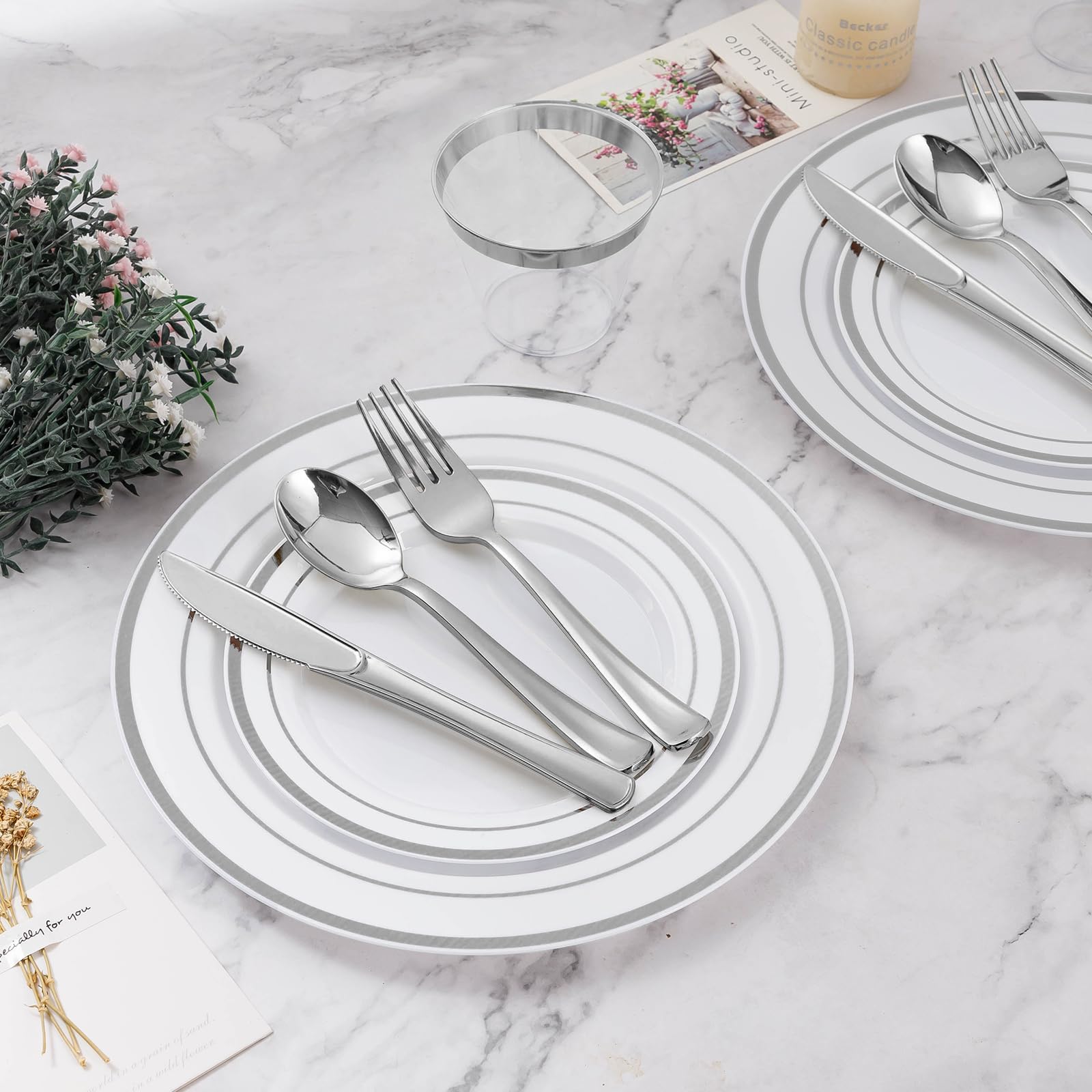 Goodluck 600-Piece Disposable Double Silver Rim Plastic Dinnerware Set for 100 Guests